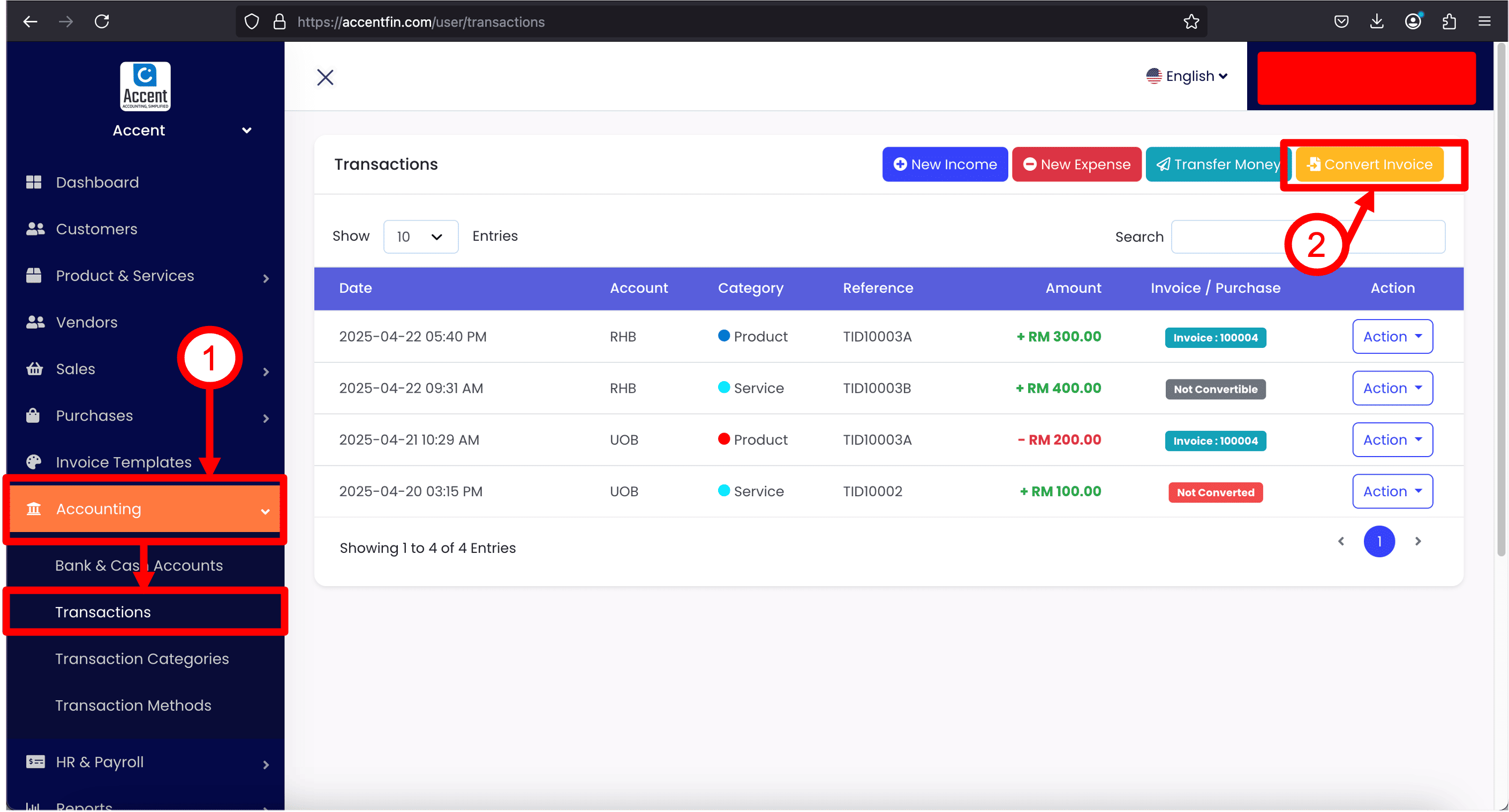 Step by step tutorial to convert transactions to invoice