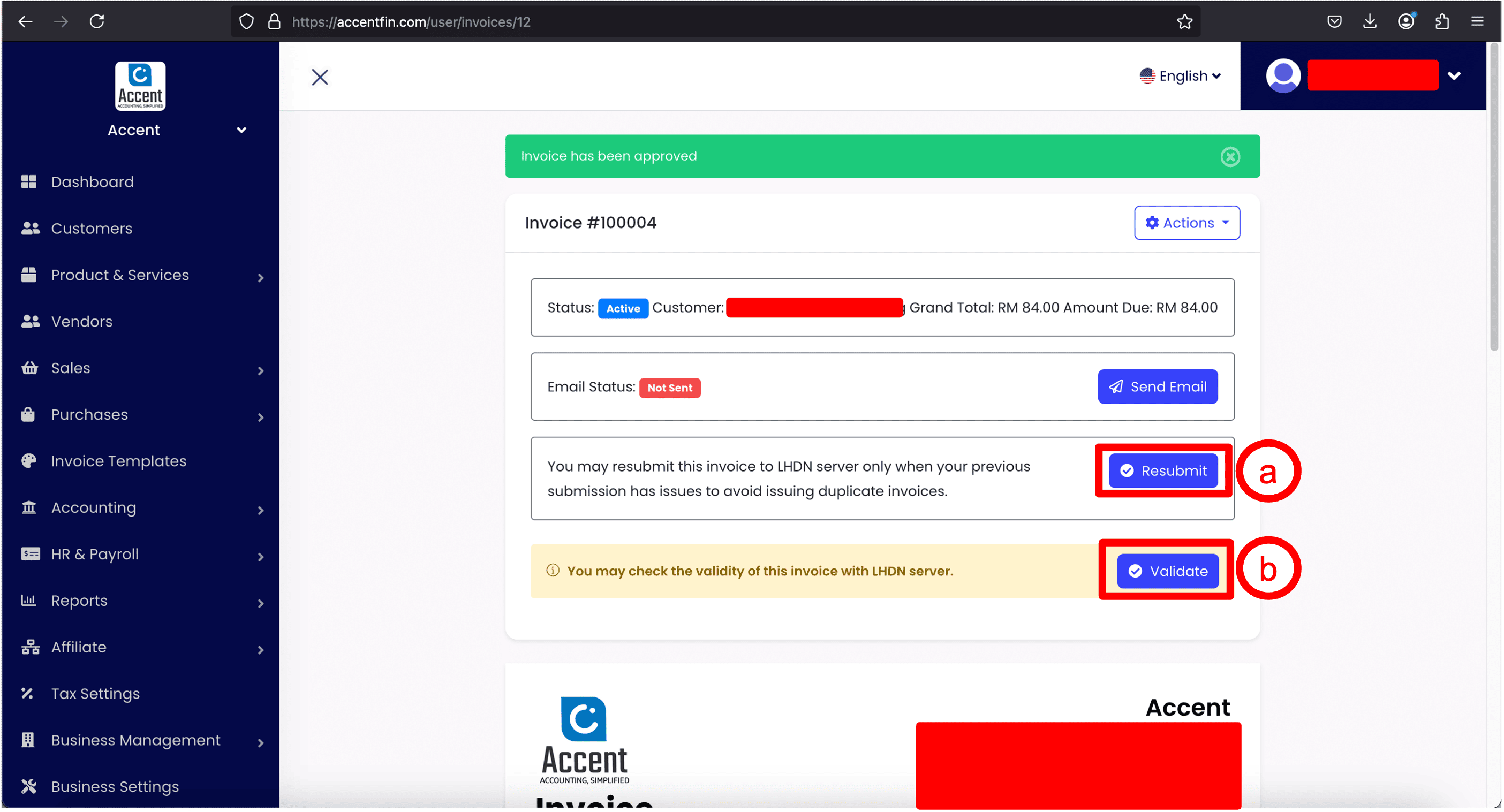 9. When you reach the details page of the newly converted invoice, click on Resubmit (a) to submit the invoice record to MyInvois Portal (LHDN server). Then click on Validate (b) to make sure the invoice record being submitted to LHDN server is accepted and valid.