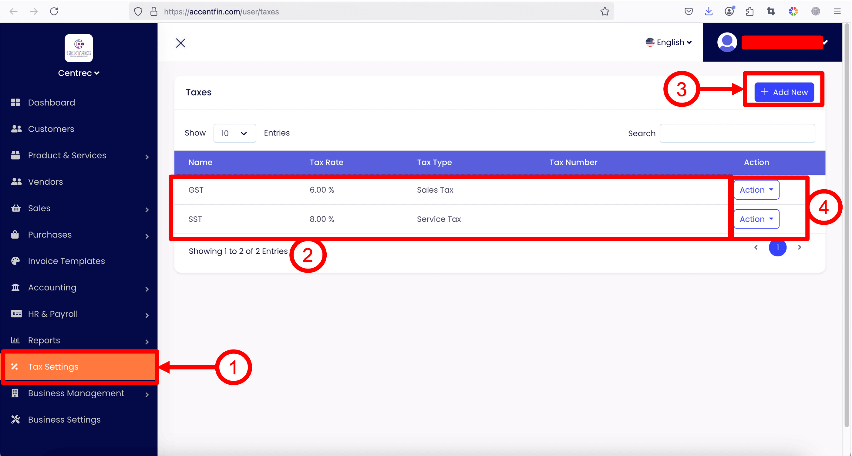 1. After you logged in to your account in Accent system, proceed to Tax Settings at the side menu.