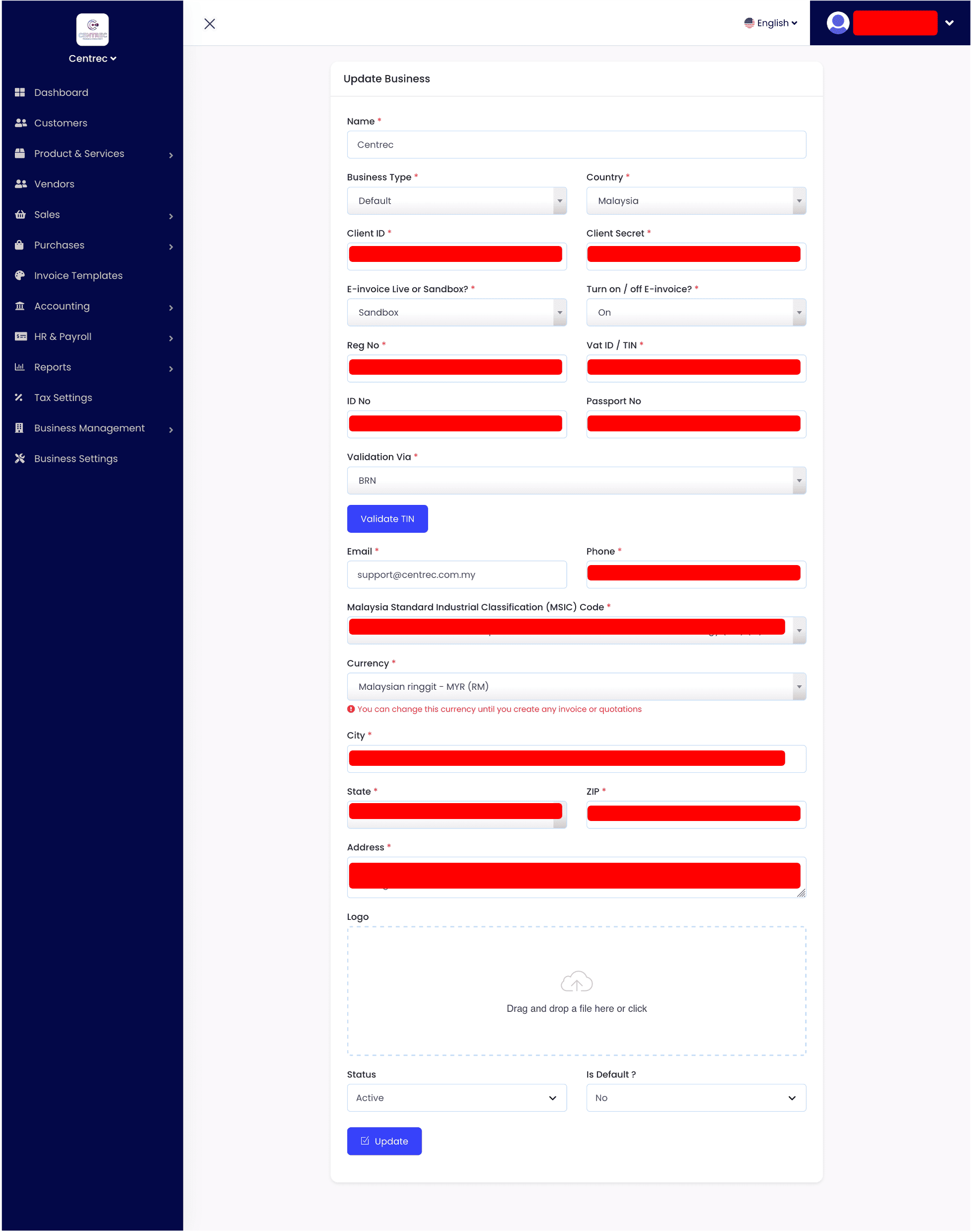 7. Please take note that Malaysia government has provided two environments for MyInvois Portal, the live / production environment (https://mytax.hasil.gov.my/) and the testing / pre-production environment (https://preprod-mytax.hasil.gov.my/), these two environments do not share the same set of Client ID and Client Secret, therefore please make sure that the Client ID and Client Secret you have filled into the business details settings are generated in the correct environment, and select the respective environment in the dropdown E-invoice Live or Sandbox?.