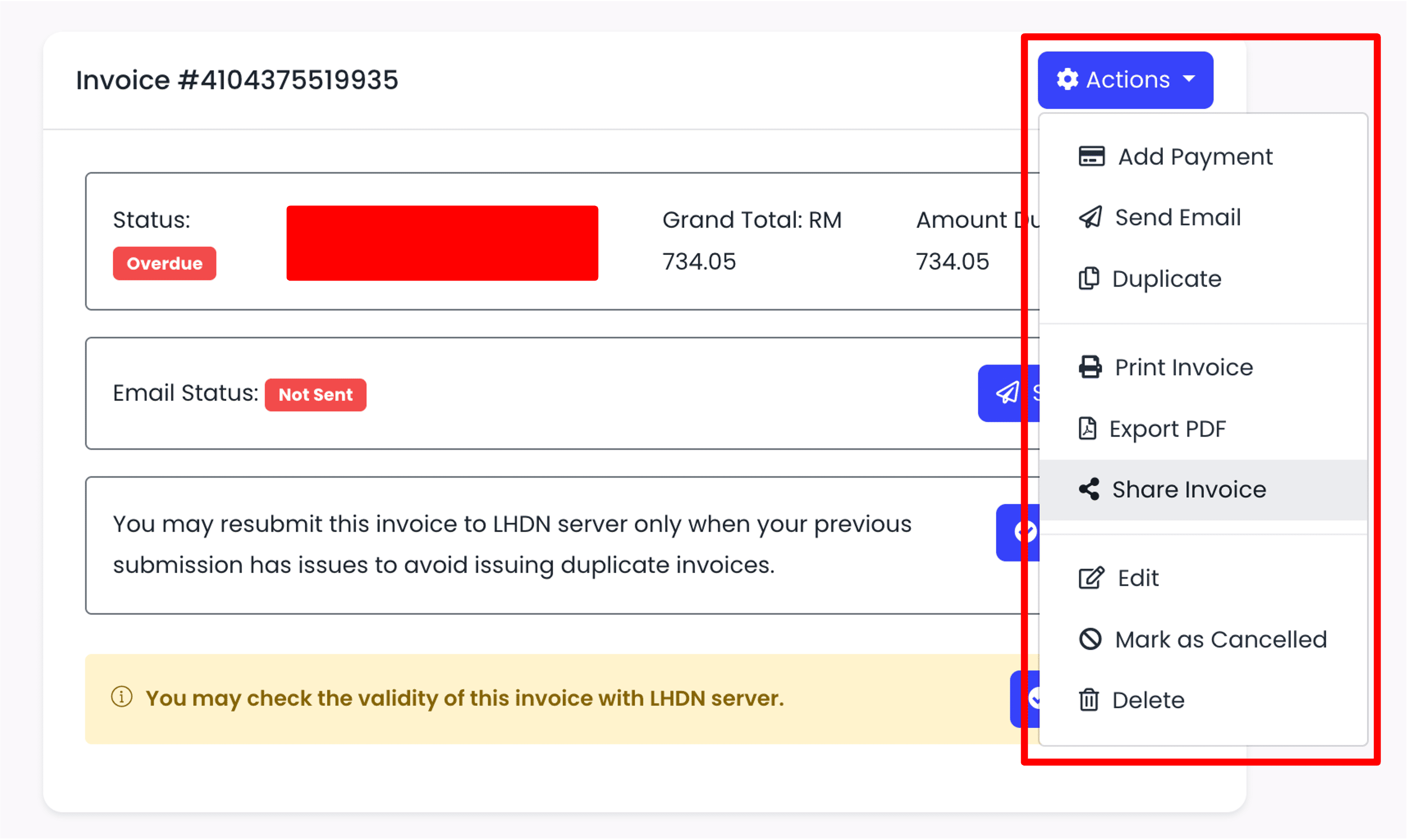 1. After you have created an invoice, you can choose to share the invoice to your customers through Email, or you may click on Actions > Share Invoice.
