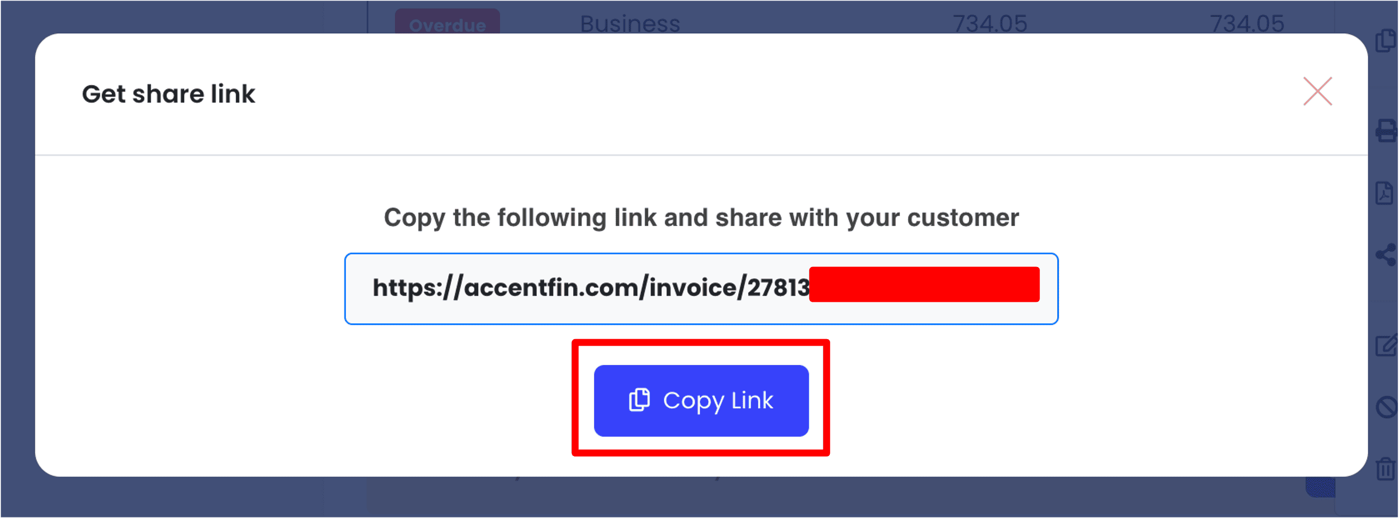 2. A popup modal will appear on your screen, the popup modal will consists the invoice link of the invoice that you have created. Click on Copy Link and share it to your customer through WhatsApp or any other communication channel.