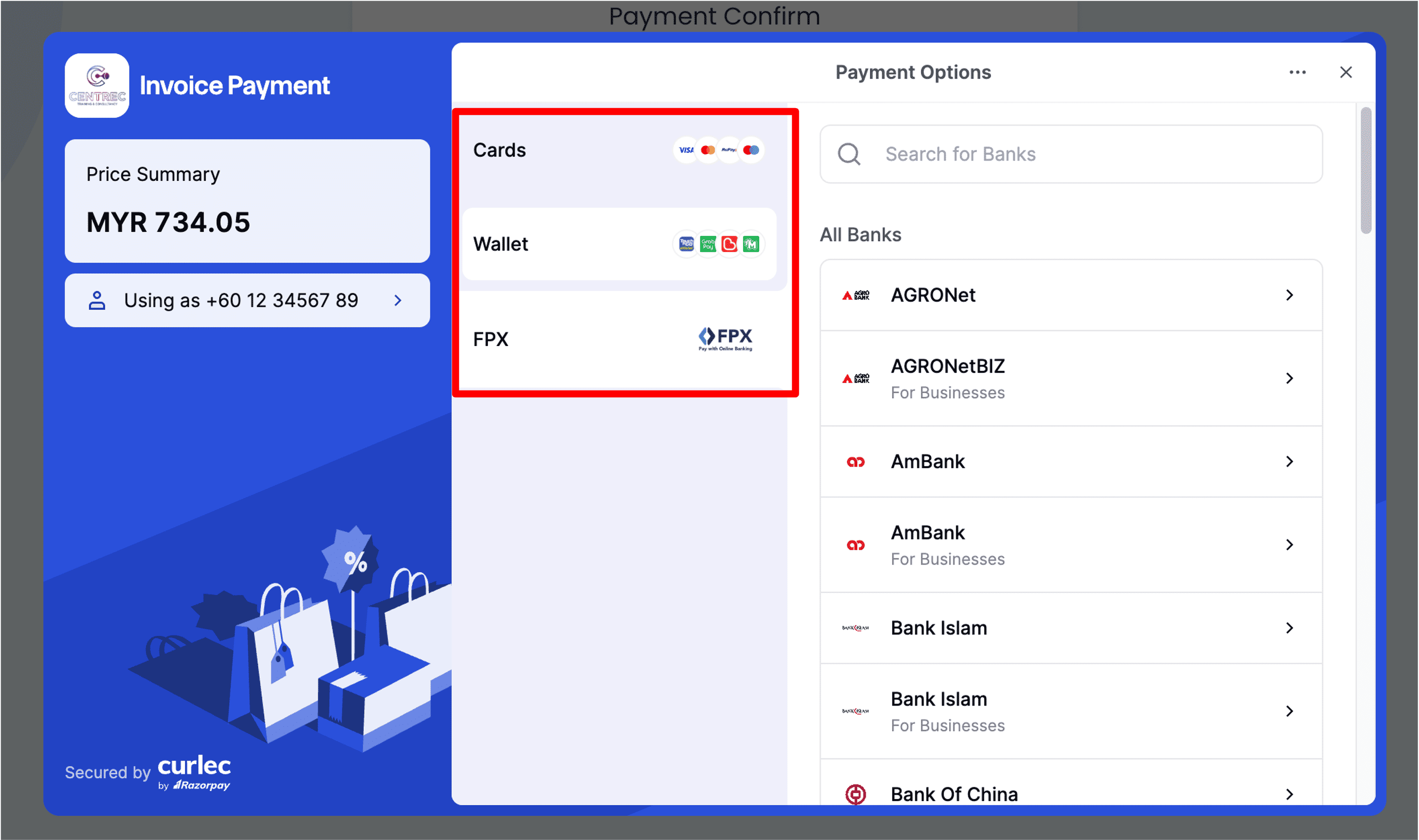 5. Depending on the payment method being selected, different payment options will be listed on the screen for your customers. Most of the payment gateways offer a variety of payment options including Credit / Debit cards, eWallets, and Online Banking (FPX).