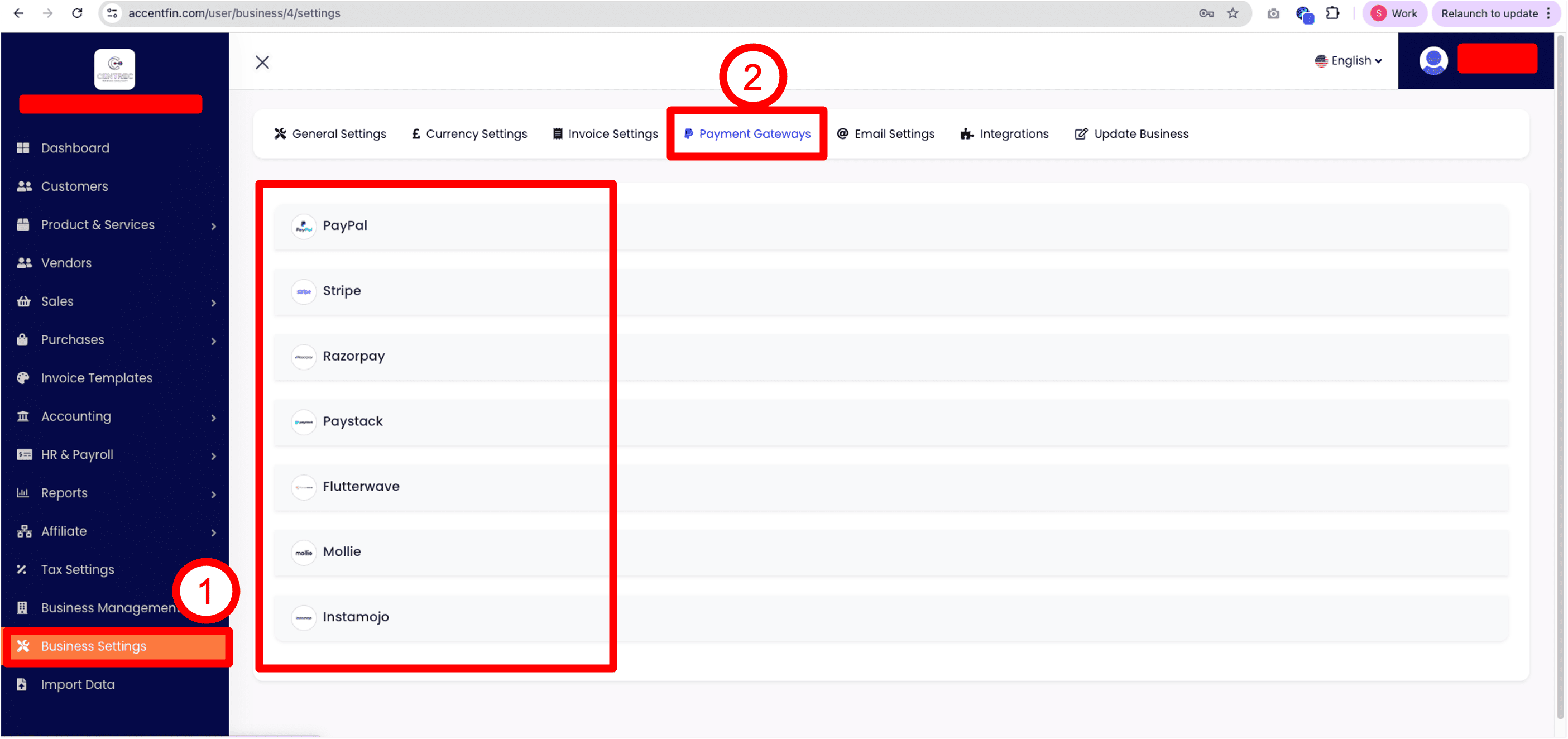 6. To setup payment methods, you may proceed to your Accent account, click on Business Settings located at the side menu. Then click on Payment Gateways. Here shows the list of payment gateways that you can integrate to offer online payment options to your customers.