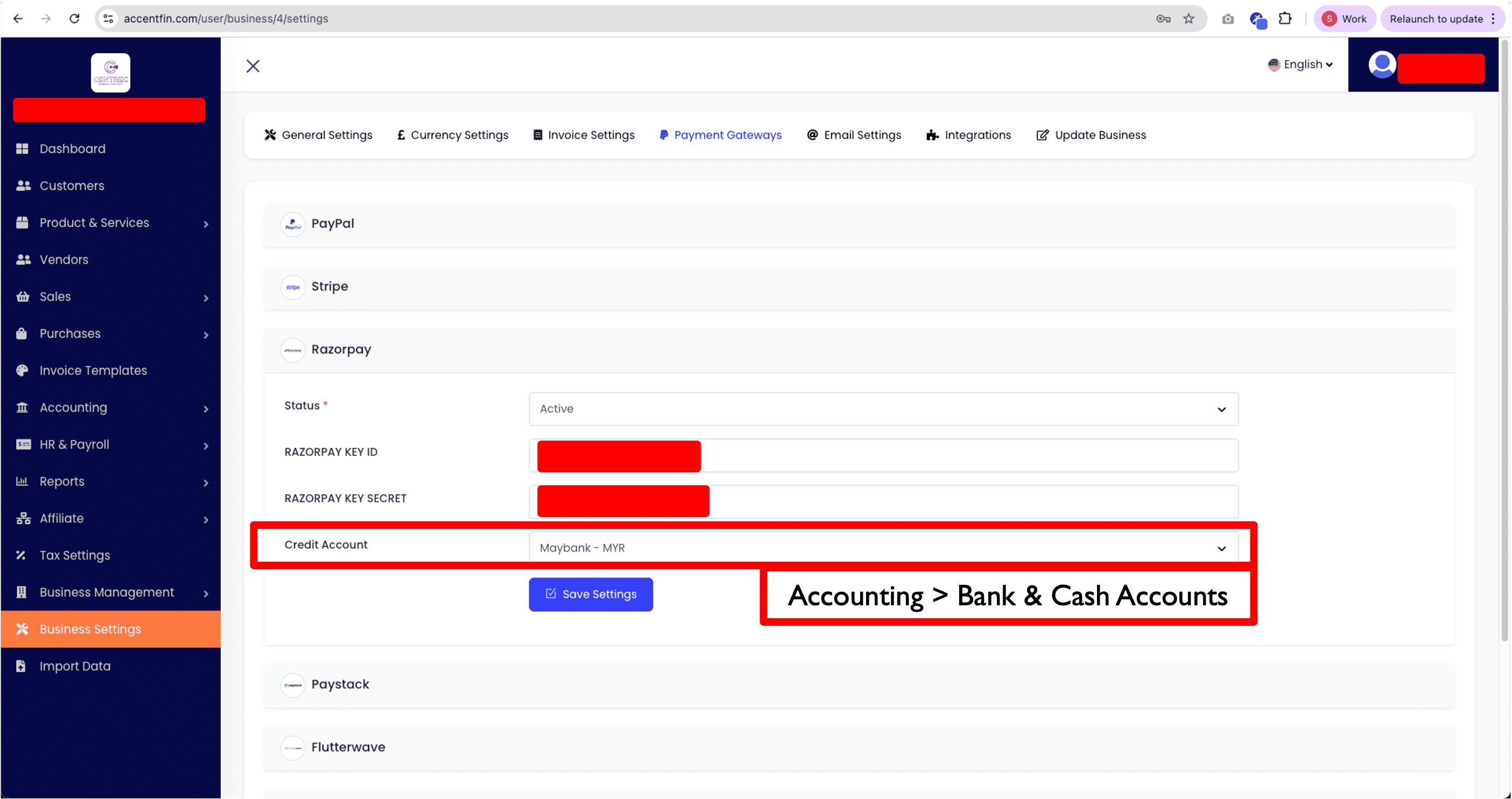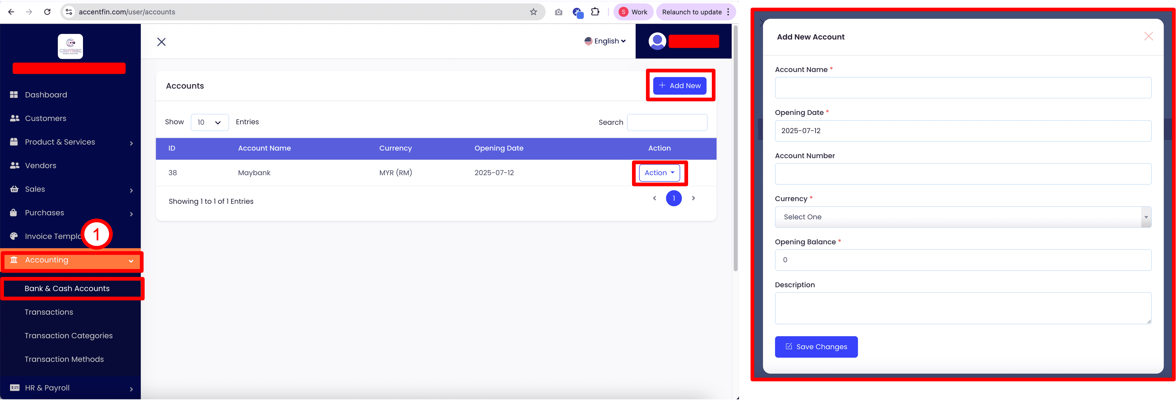 9. If you do not have any Credit Account available in the drop down, it means that you have not created the Credit Account record on Accent yet, you may proceed to Accounting > Bank & Cash Accounts located at the side menu, here you can Add New credit account or Action > Edit the existing credit account that you have created previously.