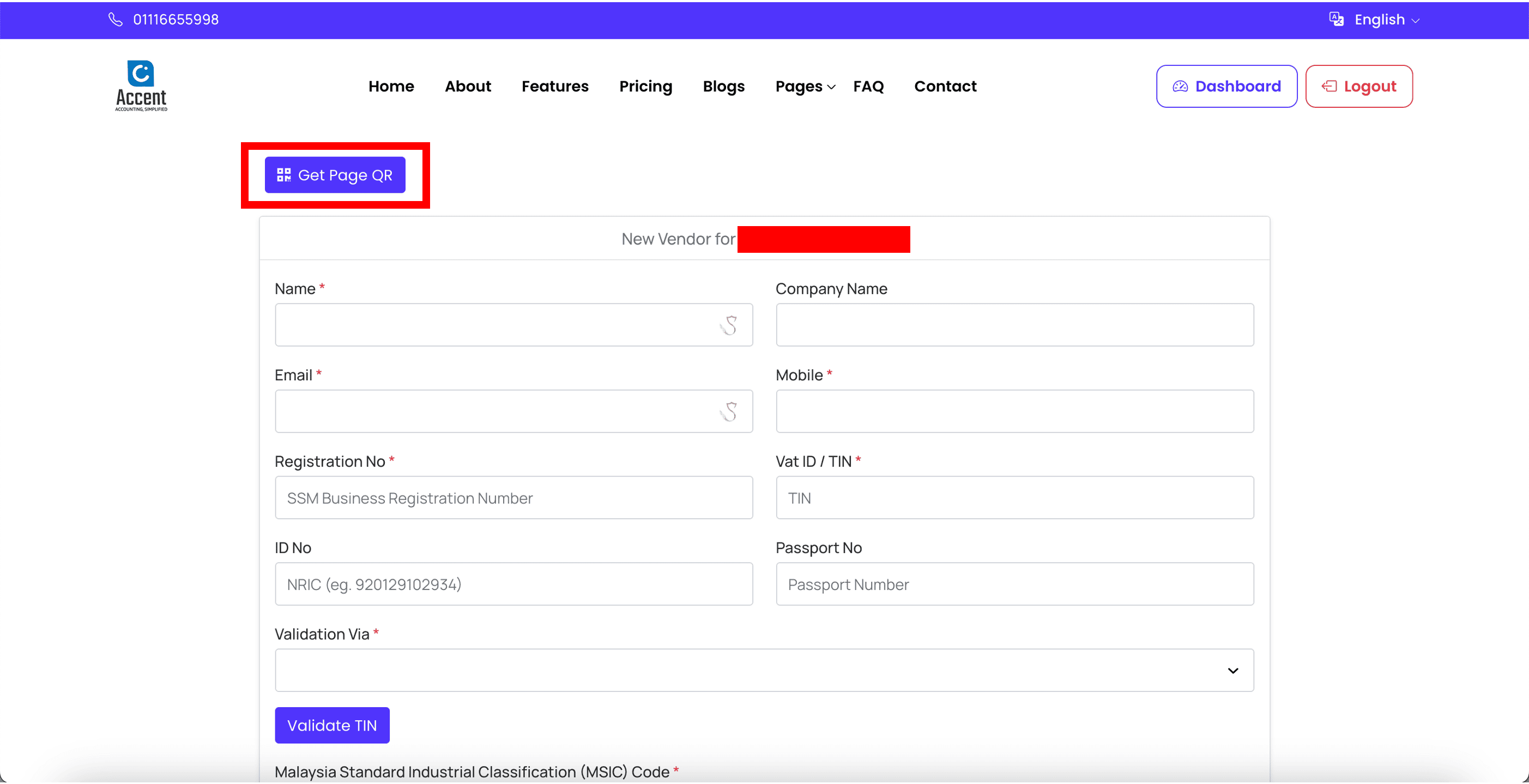 The generated QR displayed on the screen is the QR that you can share with your vendors for them to scan to fill in their details. You may click on Print QR button to print the QR onto your receipt or any surface for your vendors to scan. Note that additional adjustments might be required as different receipts or surfaces have various sizes and designs.