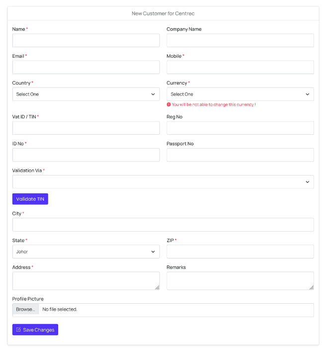 3. By clicking this button, you will be redirected to the following page (as shown in screenshot below). This page contains a publicly accessible form for your customer to fill in their details, you may share this page link / url to your customers, when they arrive at this page, they just need to fill in the necessary details and click Save Changes.