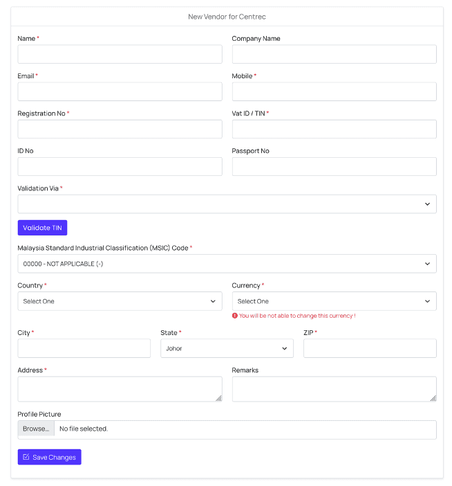 3. By clicking this button, you will be redirected to the following page (as shown in screenshot below). This page contains a publicly accessible form for your vendor to fill in their details, you may share this page link / url to your vendors, when they arrive at this page, they just need to fill in the necessary details and click Save Changes.