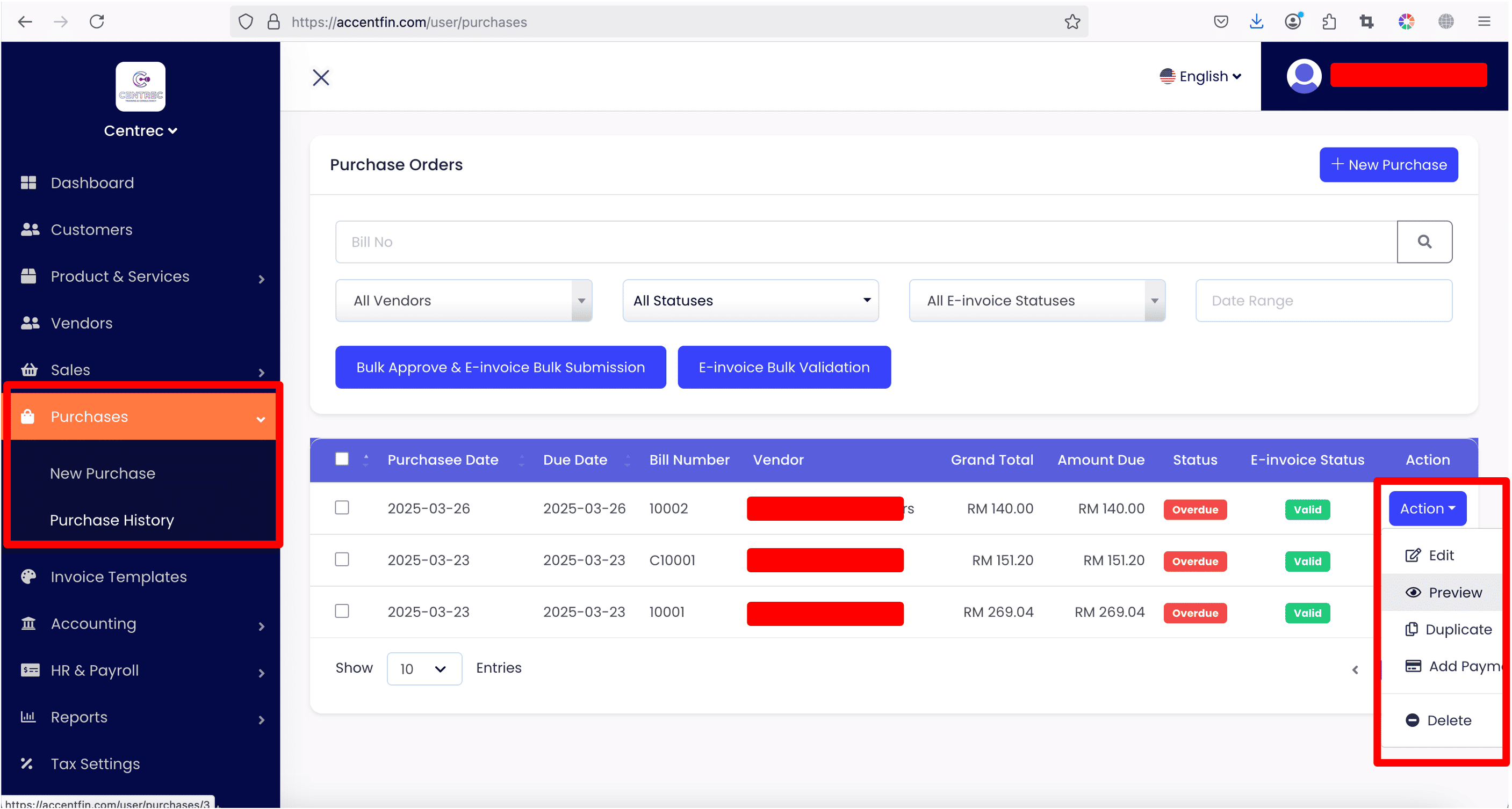 - Select your desired purchase record, click on the Action dropdown button, click on Preview button to view the purchase record's details.
