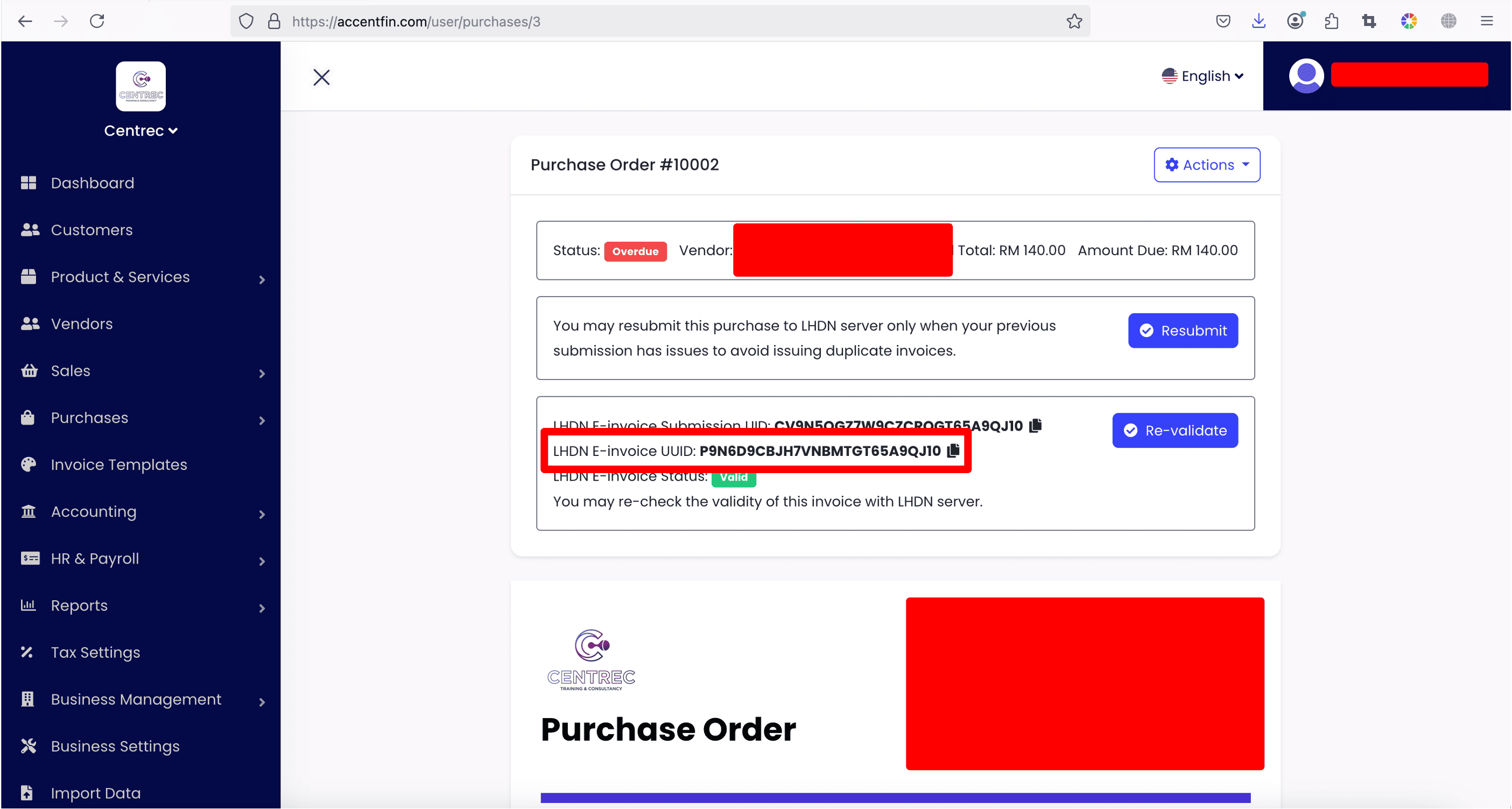 - If your purchase document has been submitted to LHDN server (MyInvois portal) and has been validated (shows Valid), you will see a line stating LHDN E-invoice UUID, click on the alphanumeric string to copy the purchase's UUID.