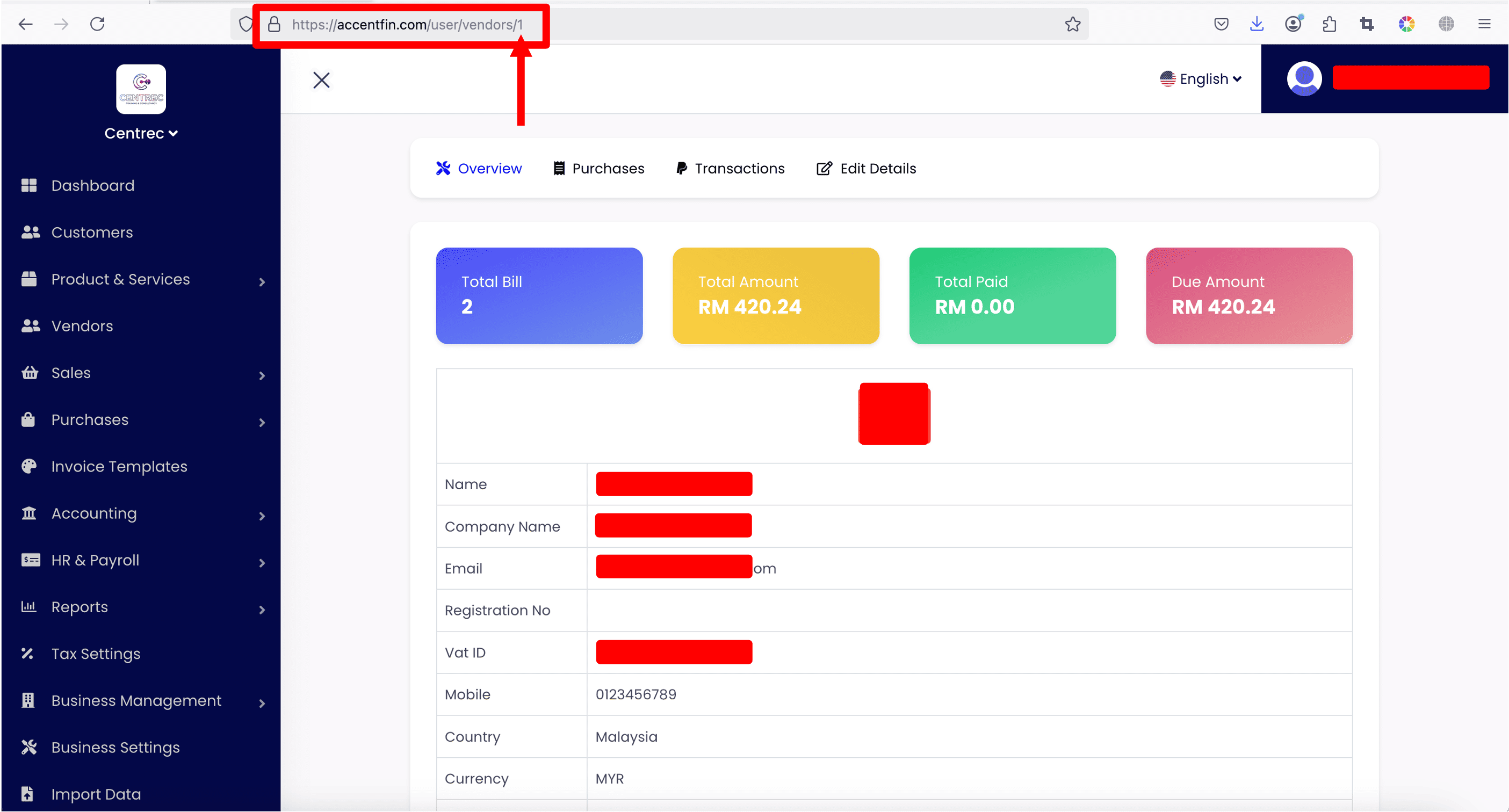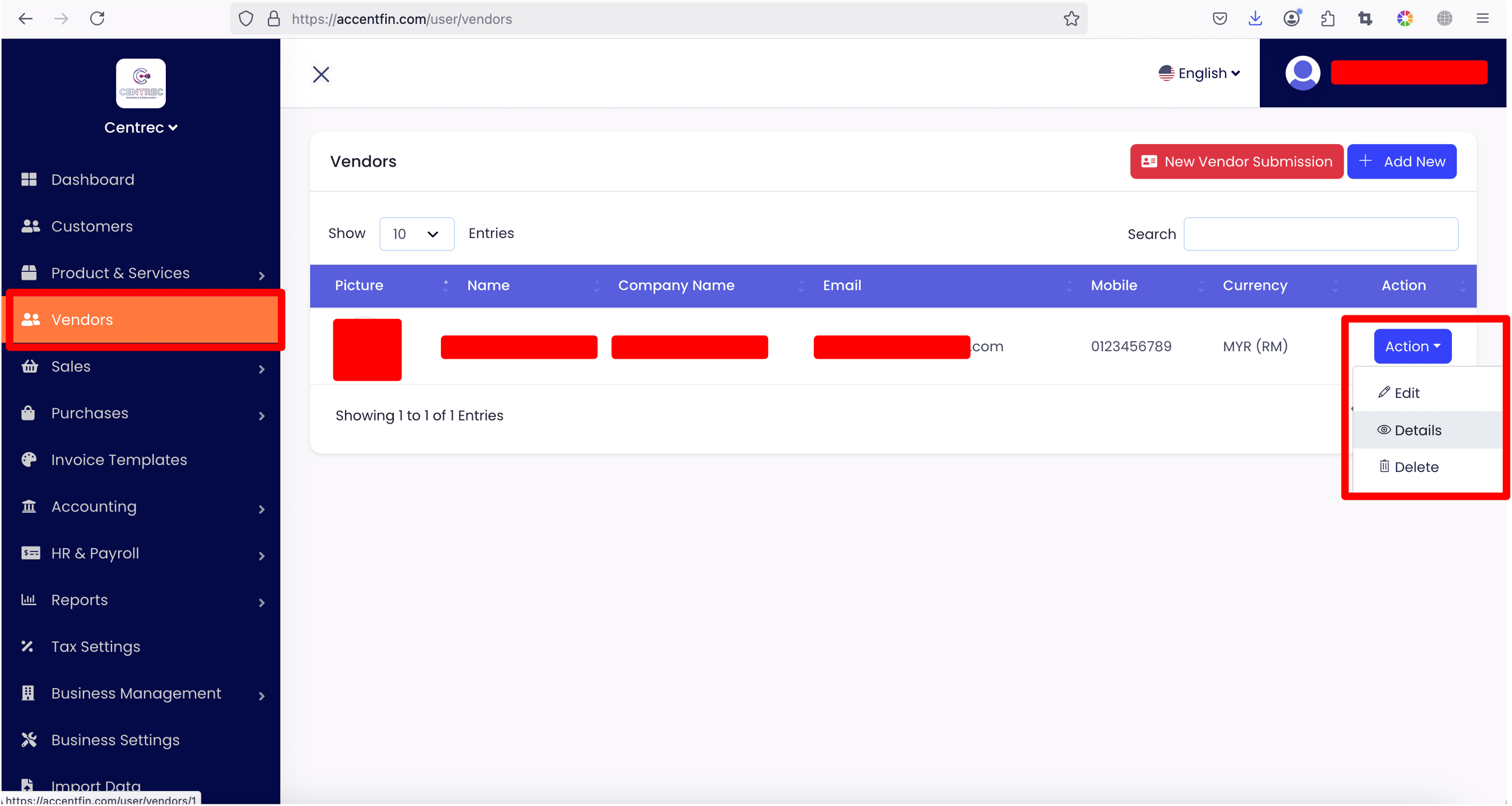 - Select your desired vendor record, click on the Action dropdown button, click on Details to open the vendor details record.