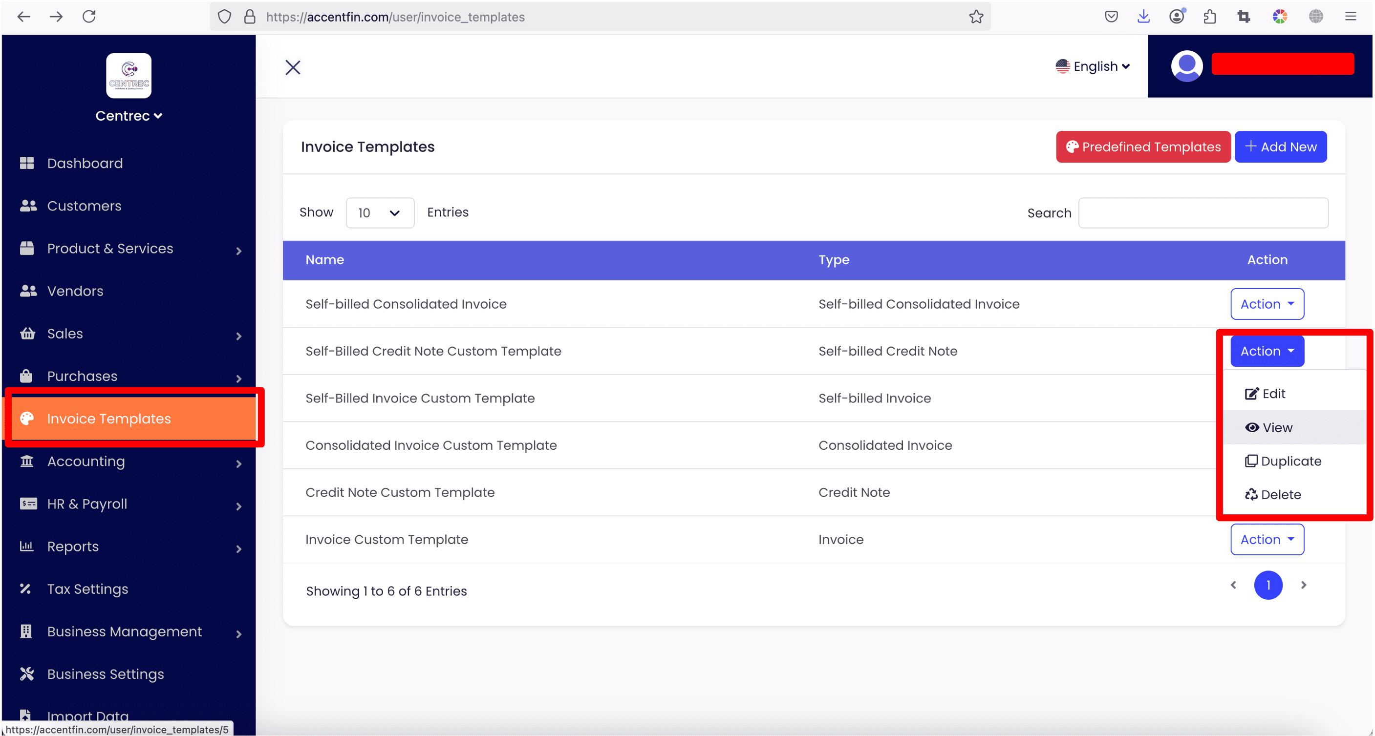 - Here shows all the invoice templates you have created previously, look for your desired invoice template record, click on the Action dropdown button, click on the View button to view the invoice template's details.