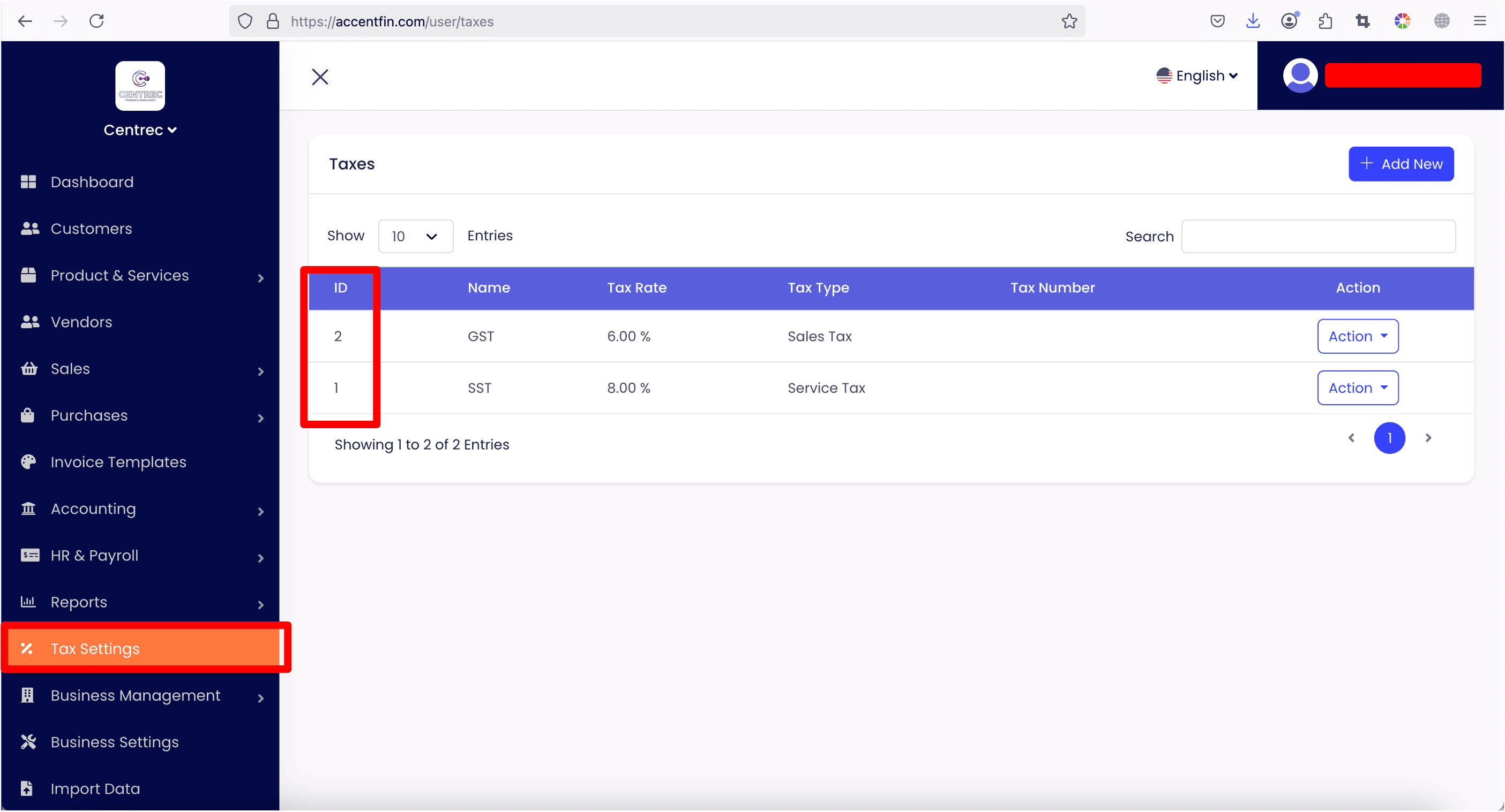 - Each tax's id is listed in the table under ID column.