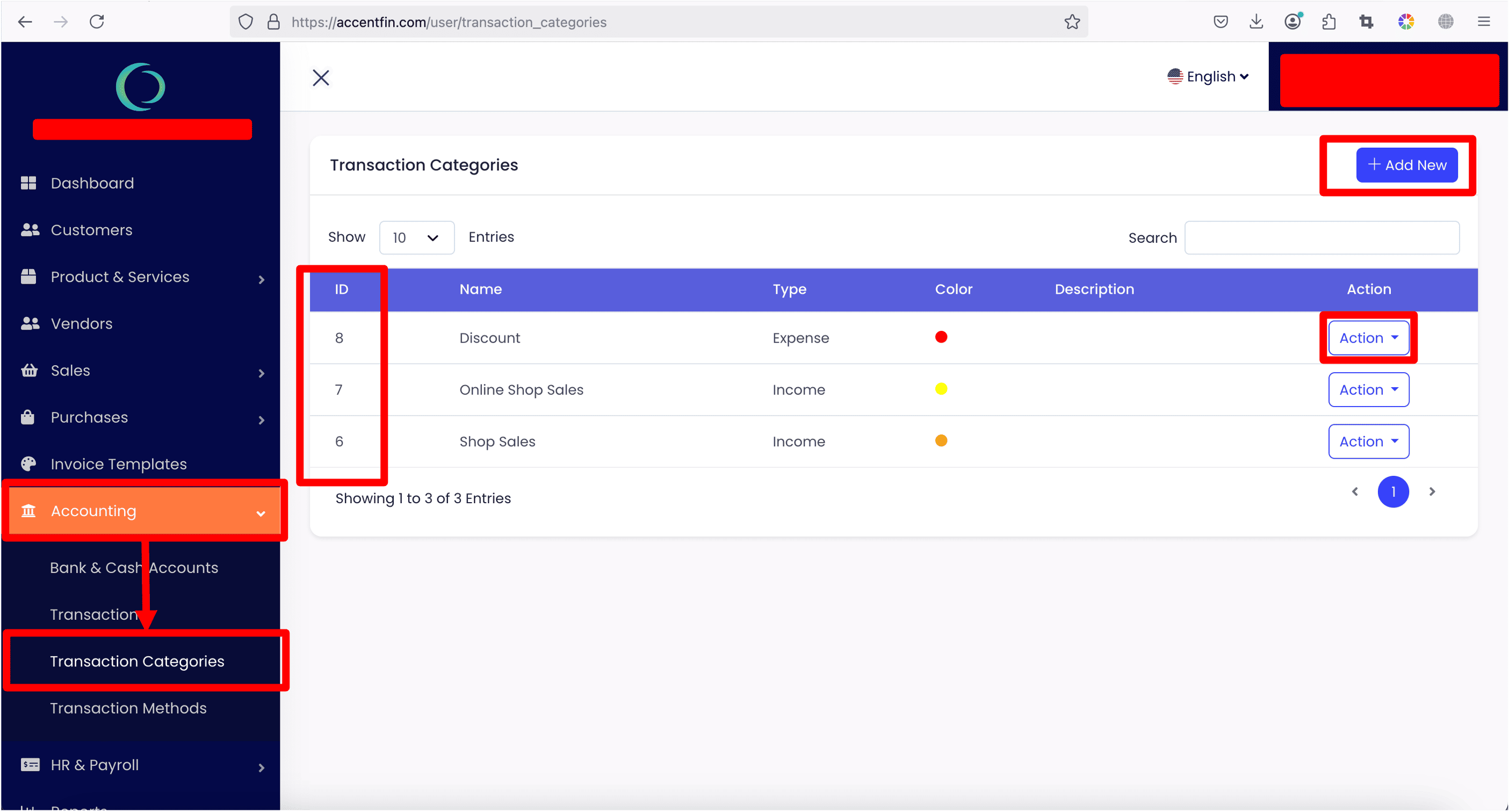 - You can create new transaction category from this page by clicking on the button + Add New.