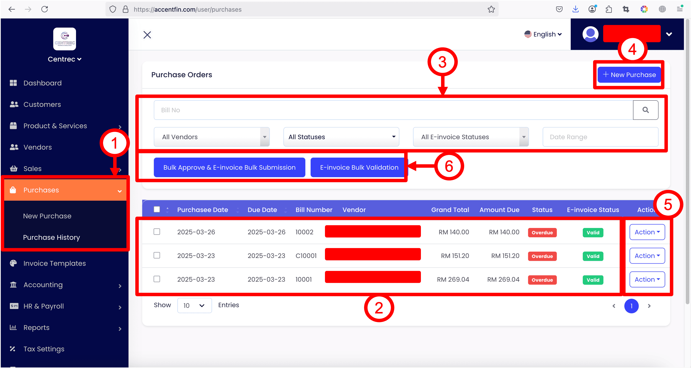 6. If you have a list of purchases (self-billed e-invoices) you wish to approve and submit to MyInvois Portal, you can select the purchases records by checking the check boxes, and click on Bulk Approve & E-invoice Bulk Submission button. After that, you can click on E-invoice Bulk Validation to validate the selected purchases records with MyInvois Portal to make sure the self-billed e-invoices you issued are valid and accepted by MyInvois Portal. Note that these two buttons will only appear if you have enabled E-invoice function of your business (Refer tutorial for more information on how to enable E-invoice function).