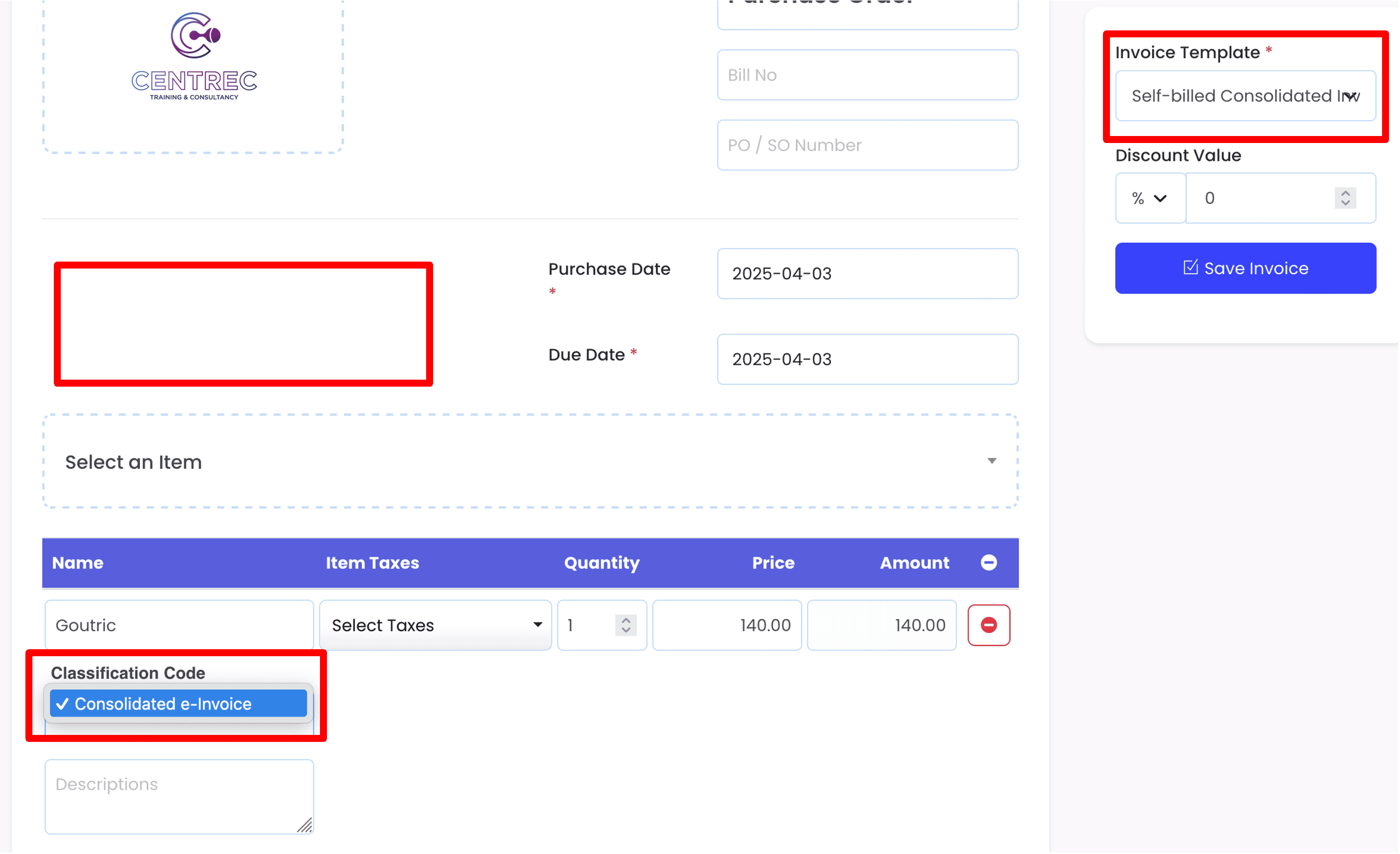 14. Lastly, select the correct Invoice Template and click Save Invoice to save all changes. Refer to this tutorial for more information on what is Invoice Template.