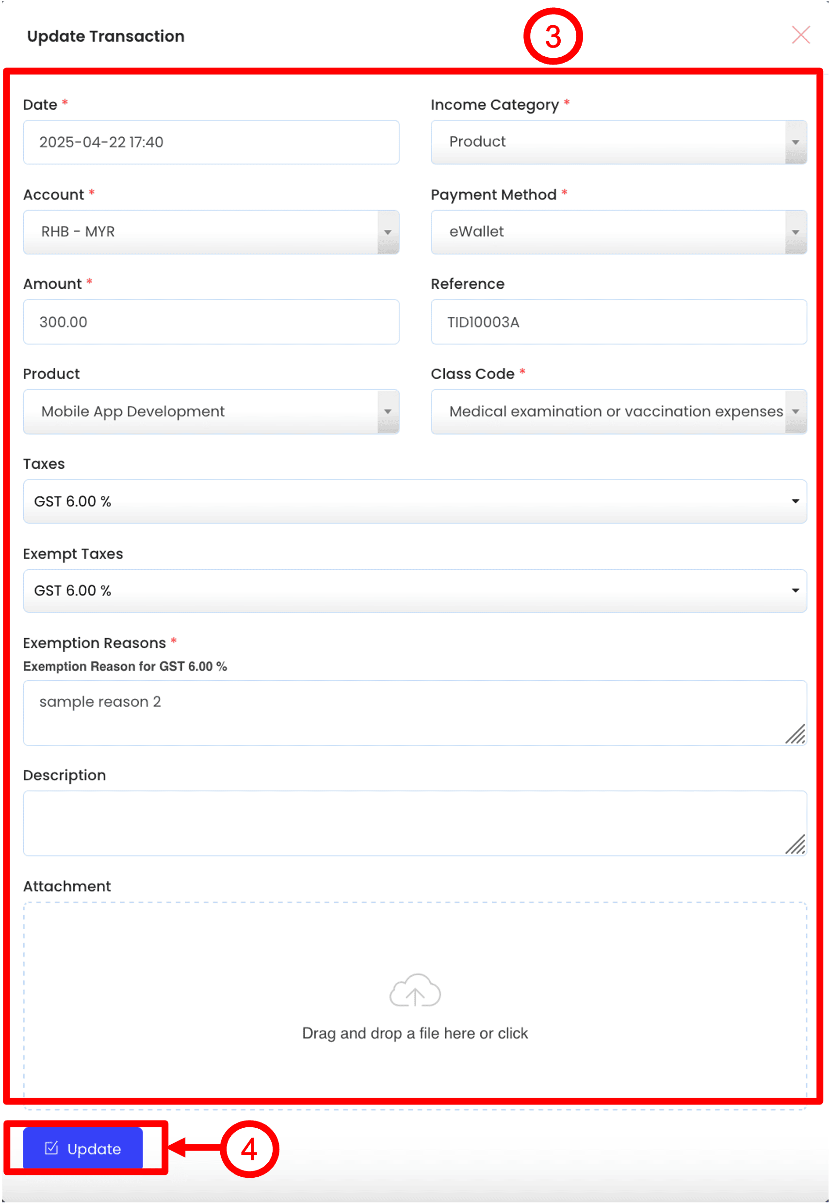 3. Fill in the necessary details for the transaction record. (Tax settings will be elaborated at the end of this tutorial)