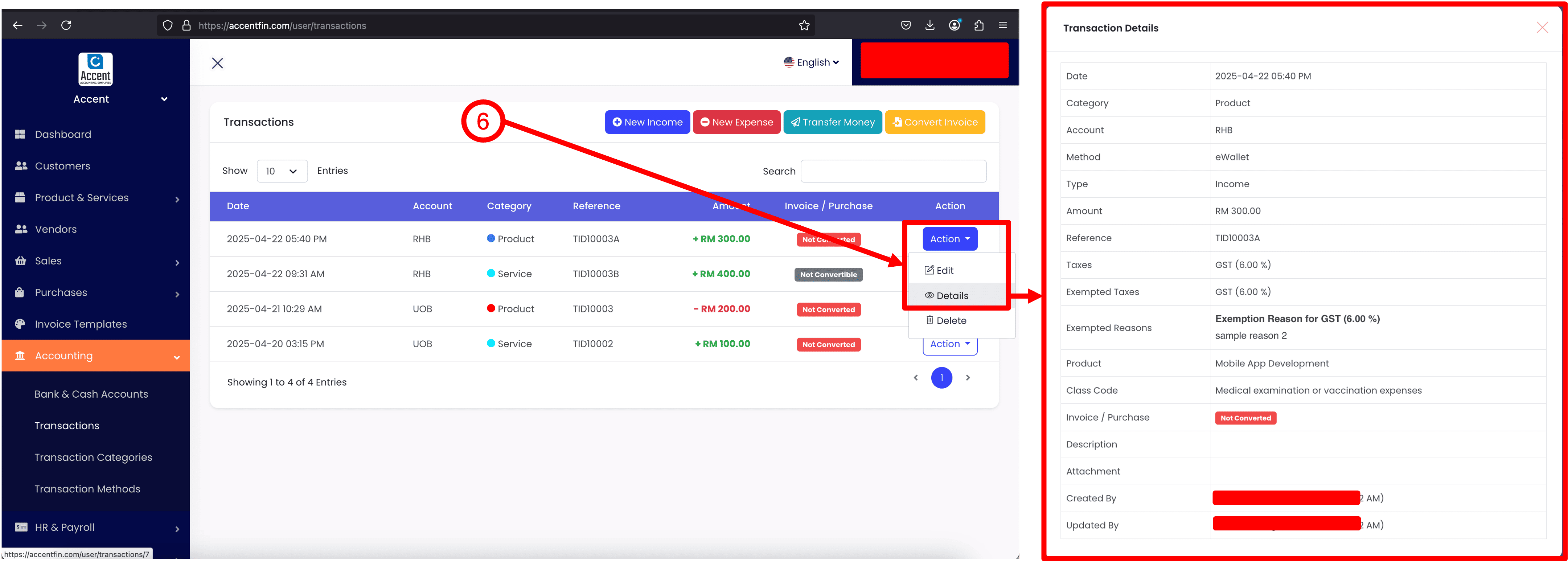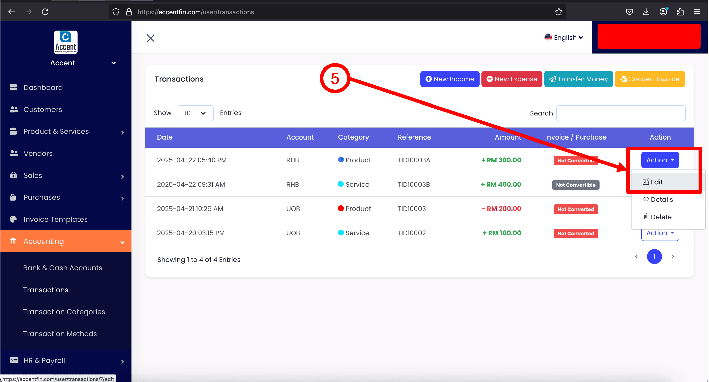 5. To edit existing transaction record, click on the Action button and click Edit.
