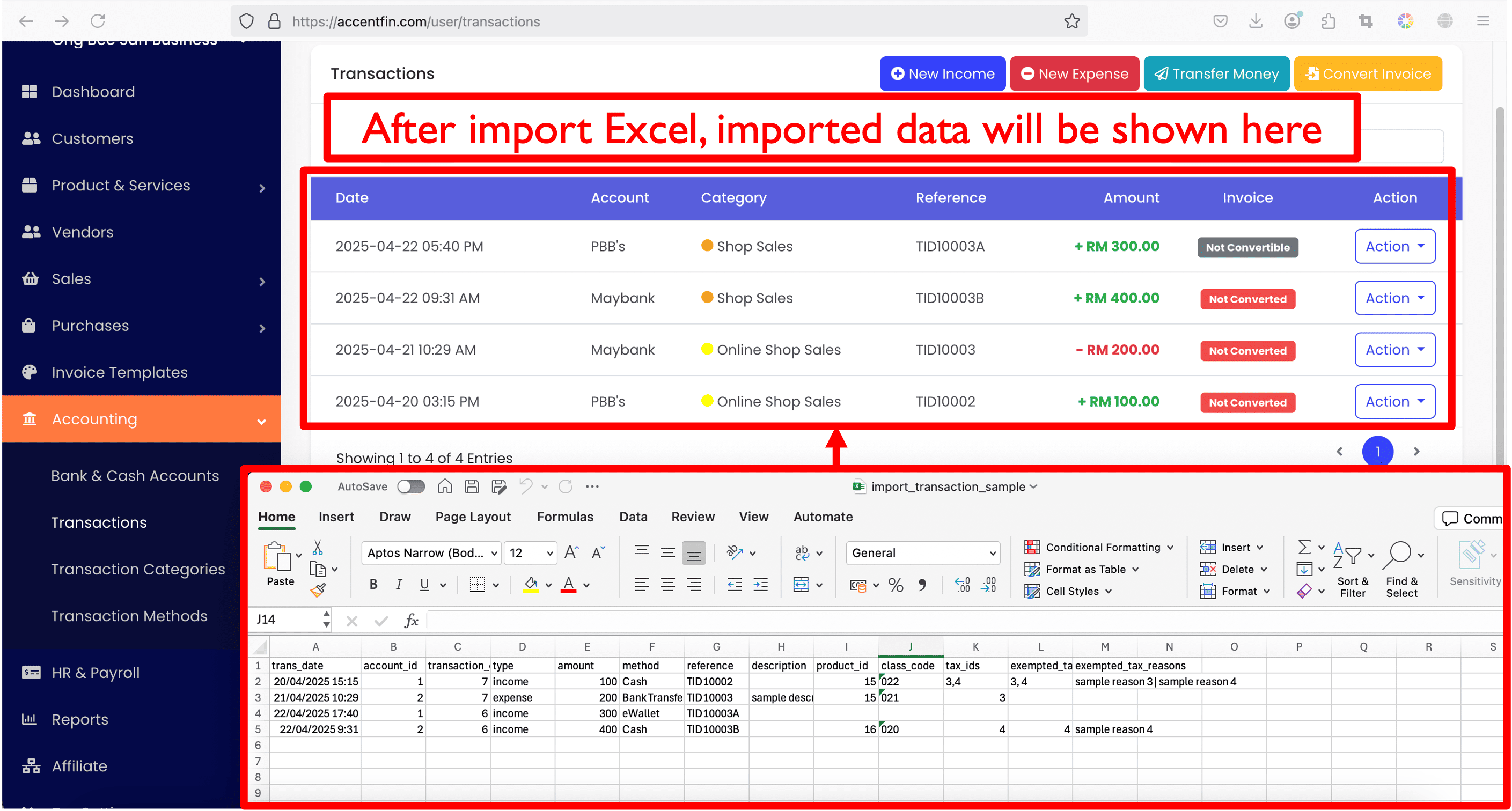 You may refer to this link for step by step tutorial to import transactions data into the system.