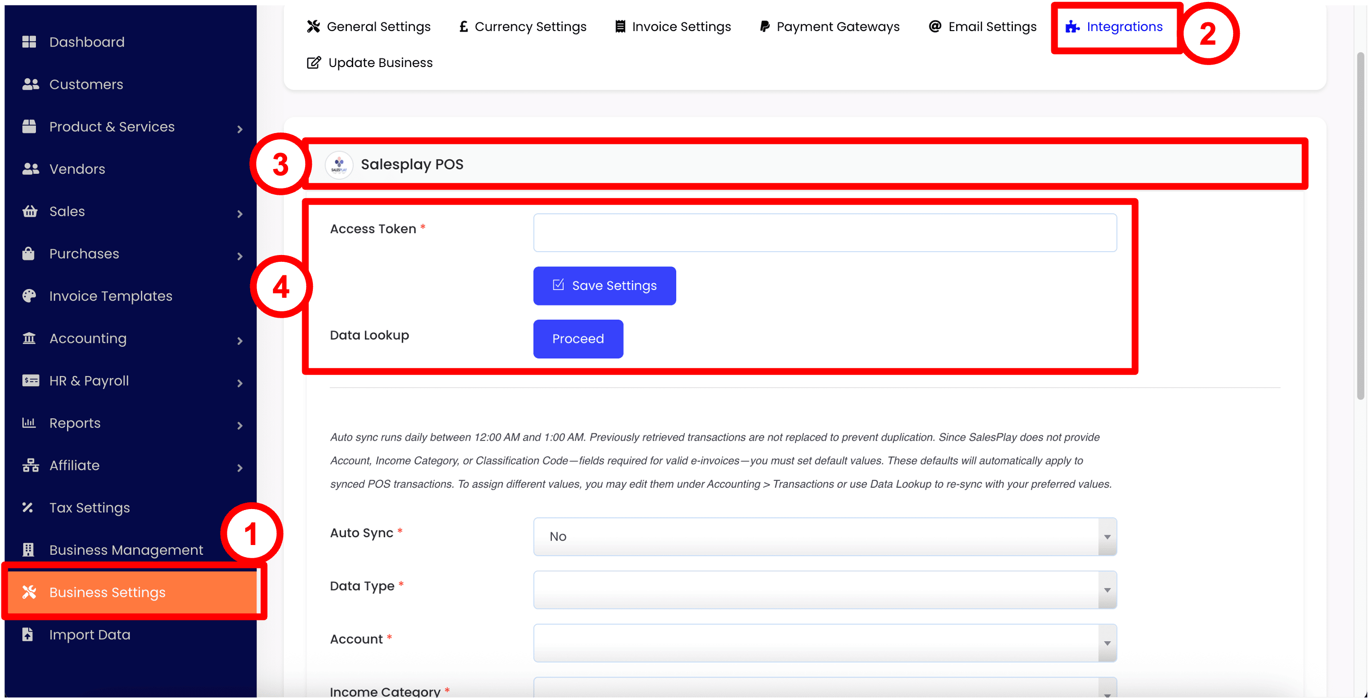 1. You may proceed to Business Settings located at the side menu. Then click on Integrations located at the top bar. Click on Salesplay POS to expand its settings.