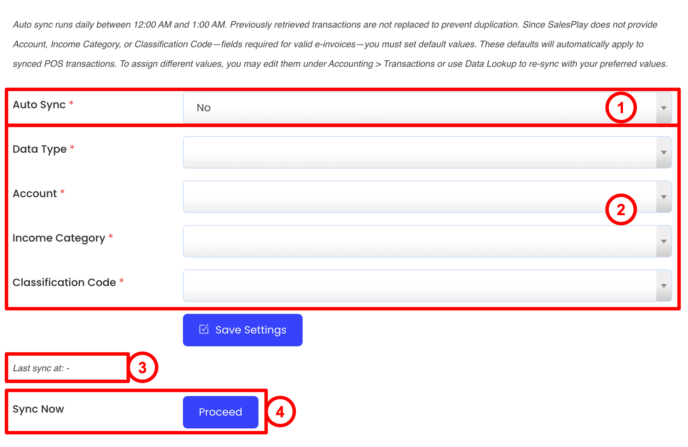 --> 2. As Salesplay does not provide values for Data Type, Account, Income Category, Classification Code, therefore it is compulsory to provide a default value for these fields. Please remember to Save Settings after filling the values.