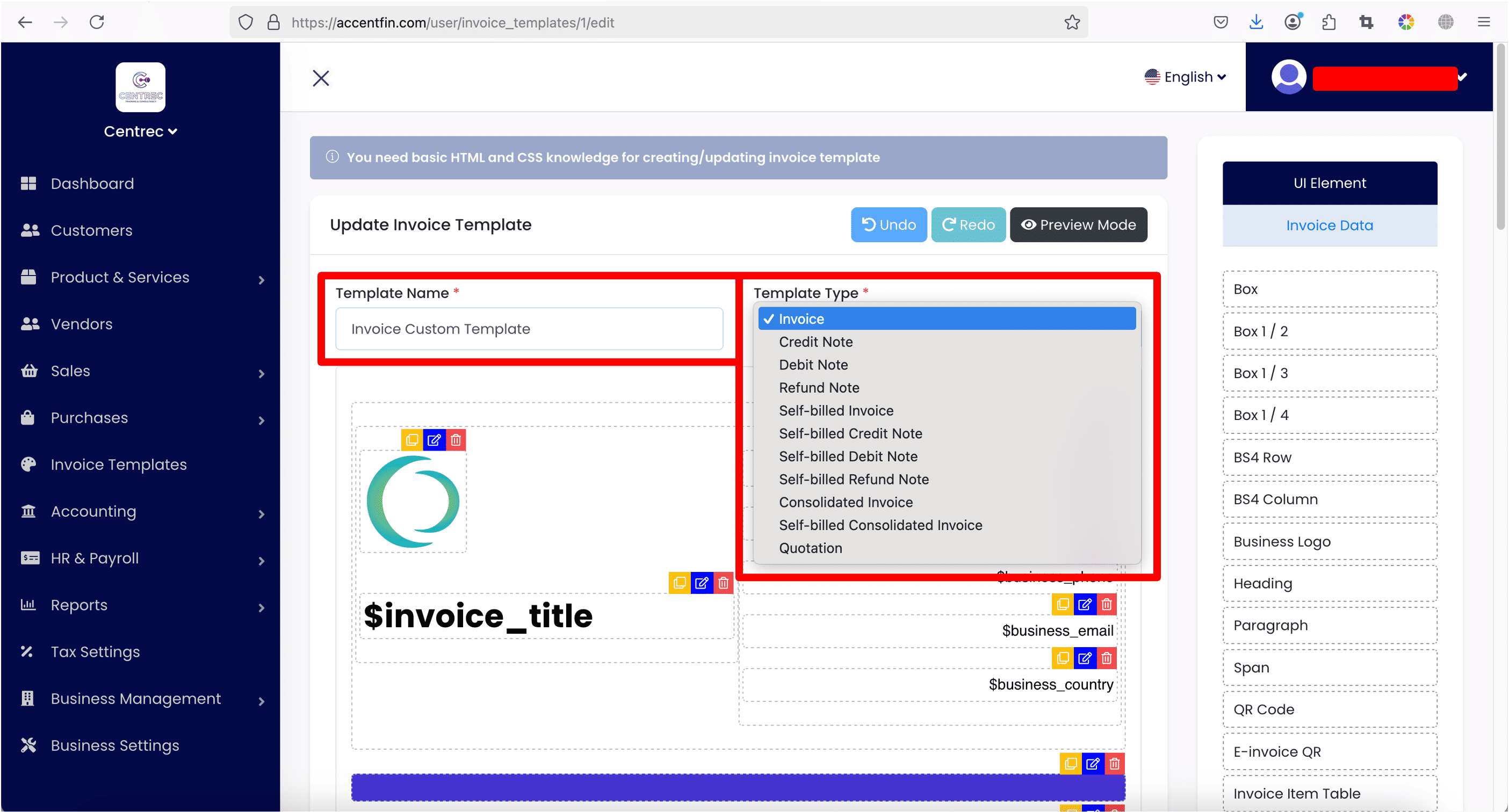 9. In the Invoice Template editing screen, you can freely design how your invoice layout should look like. To do this, you can click on UI Element at the top right corner, then you will see a list of available elements such as Box, Box 1/2 and so on. You may drag and drop any of the elements here into your template layout and edit them accordingly.