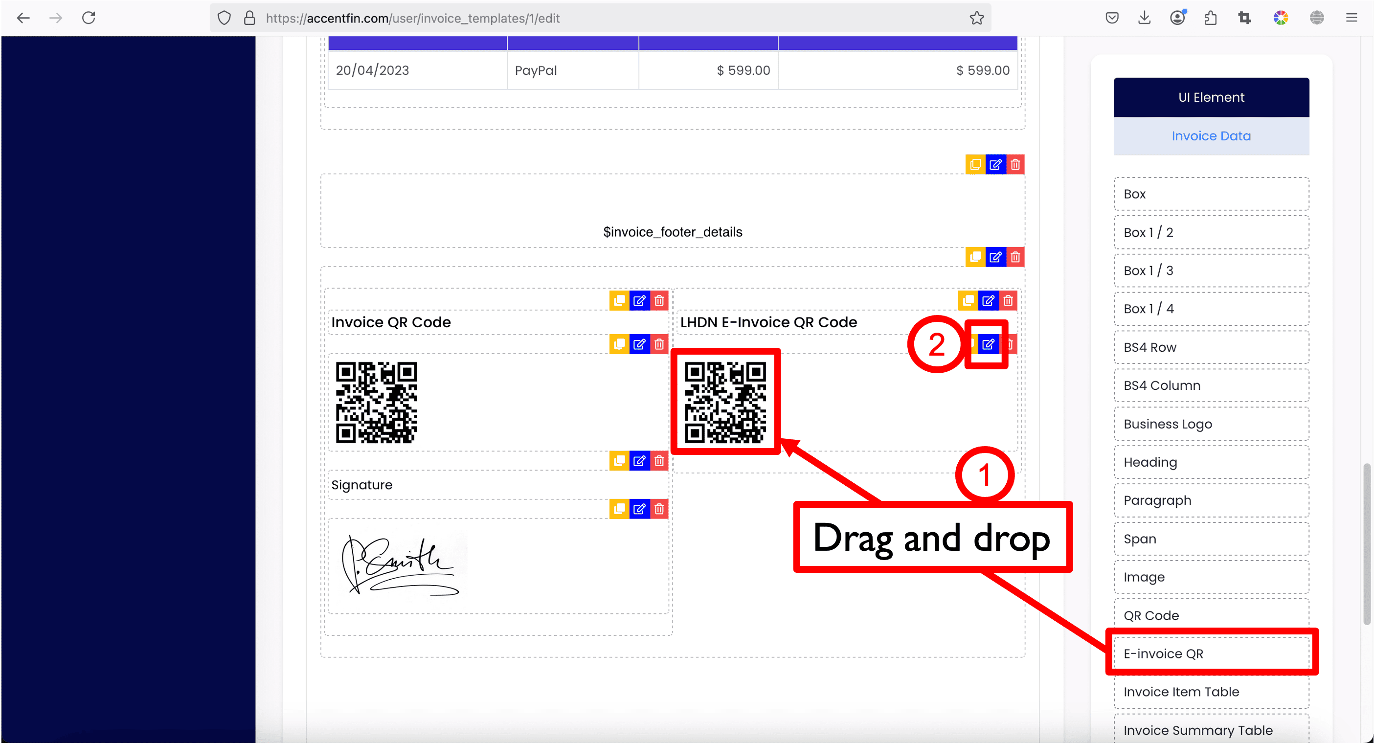 1. At the page where you edit your invoice template, scroll down and look for a UI Element named E-invoice QR, drag and drop the element into the template and place it wherever you want.