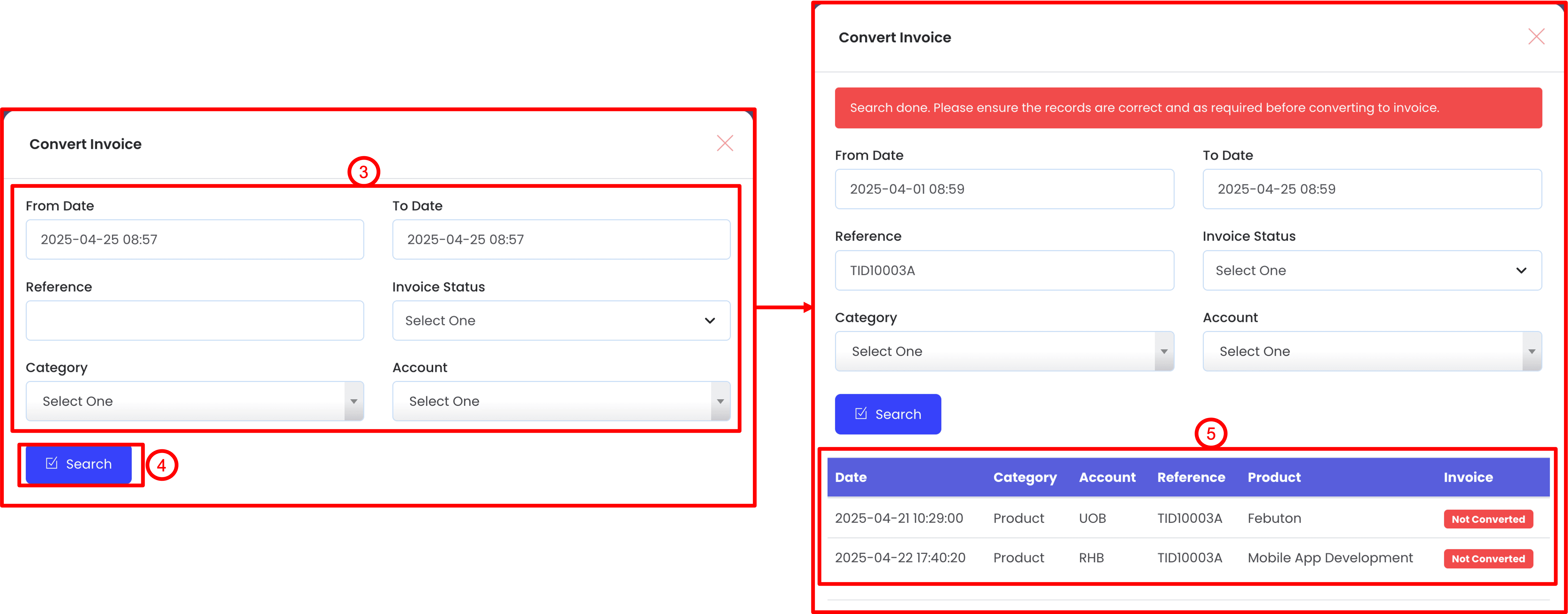 5. The results will be shown in a table here, you may double check the returned results and make sure the transaction records filtered are correct before proceeding to convert them into invoice.