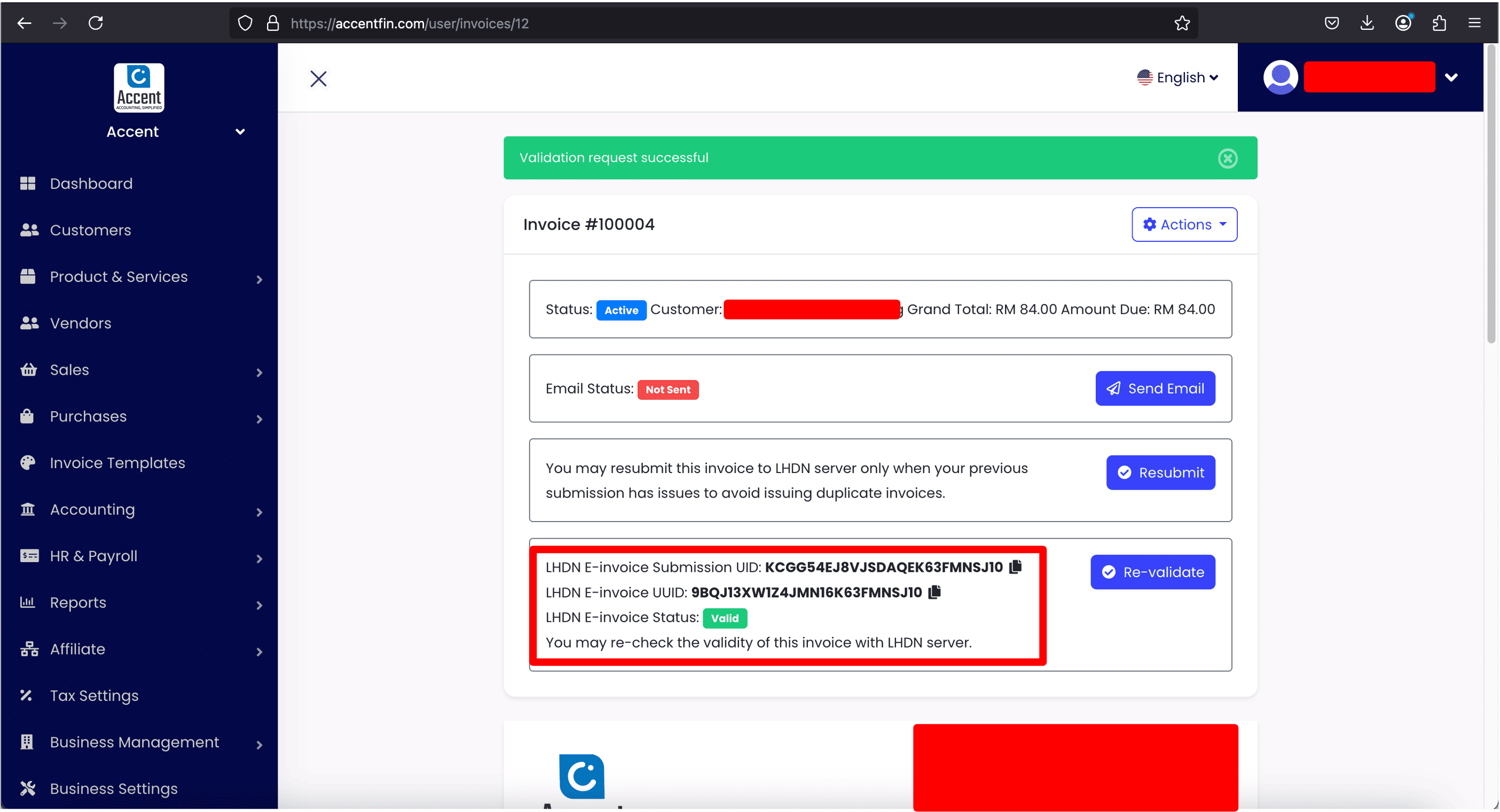 10. Once the invoice record is validated, you will be able to see and copy the E-invoice Submission UID and E-invoice UUID of the invoice record (for your reference). Then, you can freely share this invoice to your customer.