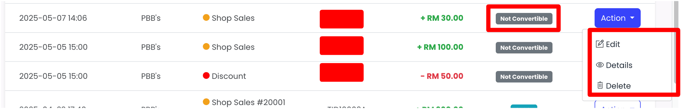 b. Find the specific transaction record that your customer requested, click on Action dropdown button.