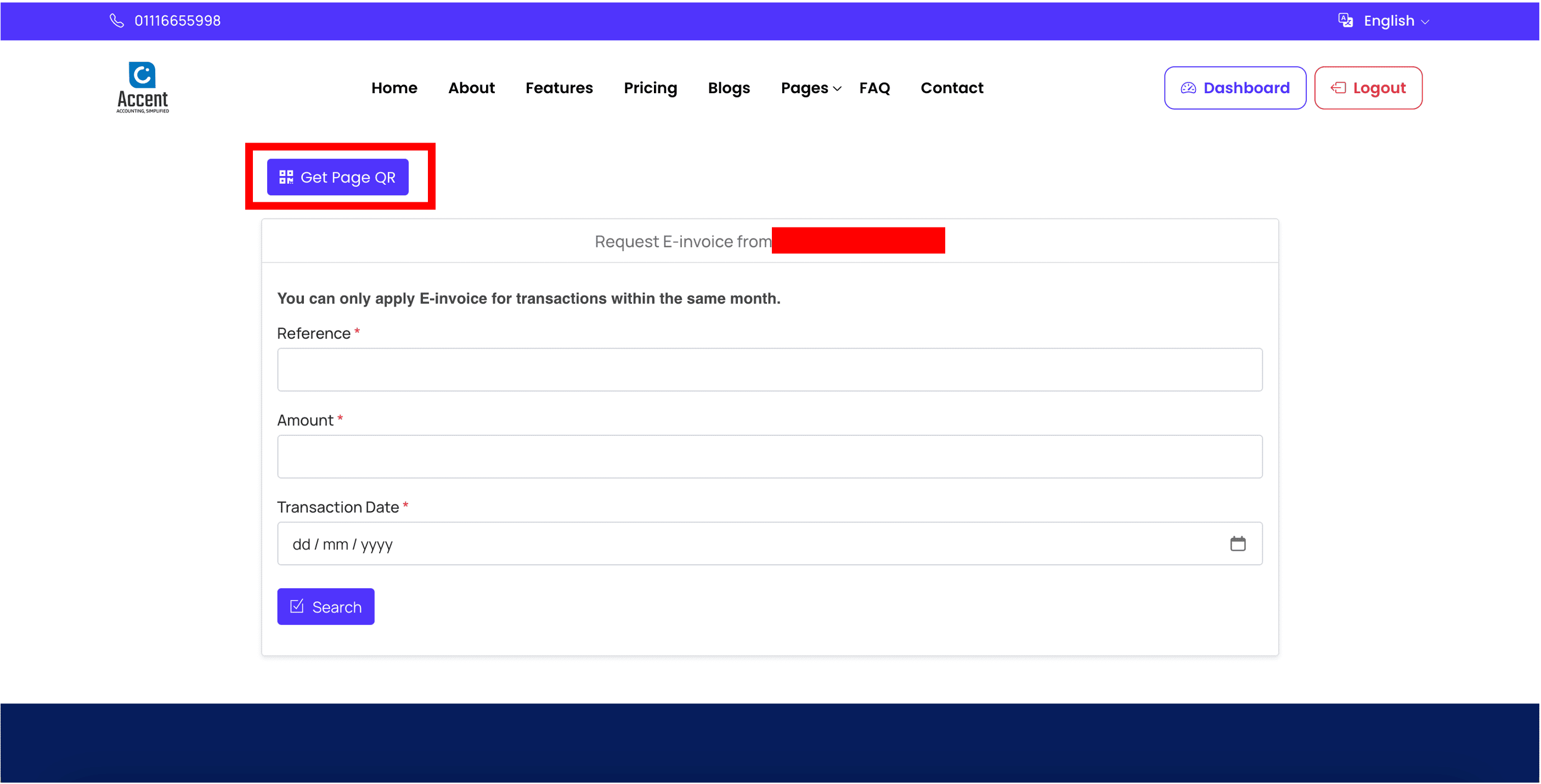 At this E-invoice requesting form page, click on Get Page QR button. Note that you must be logged in to view this button.