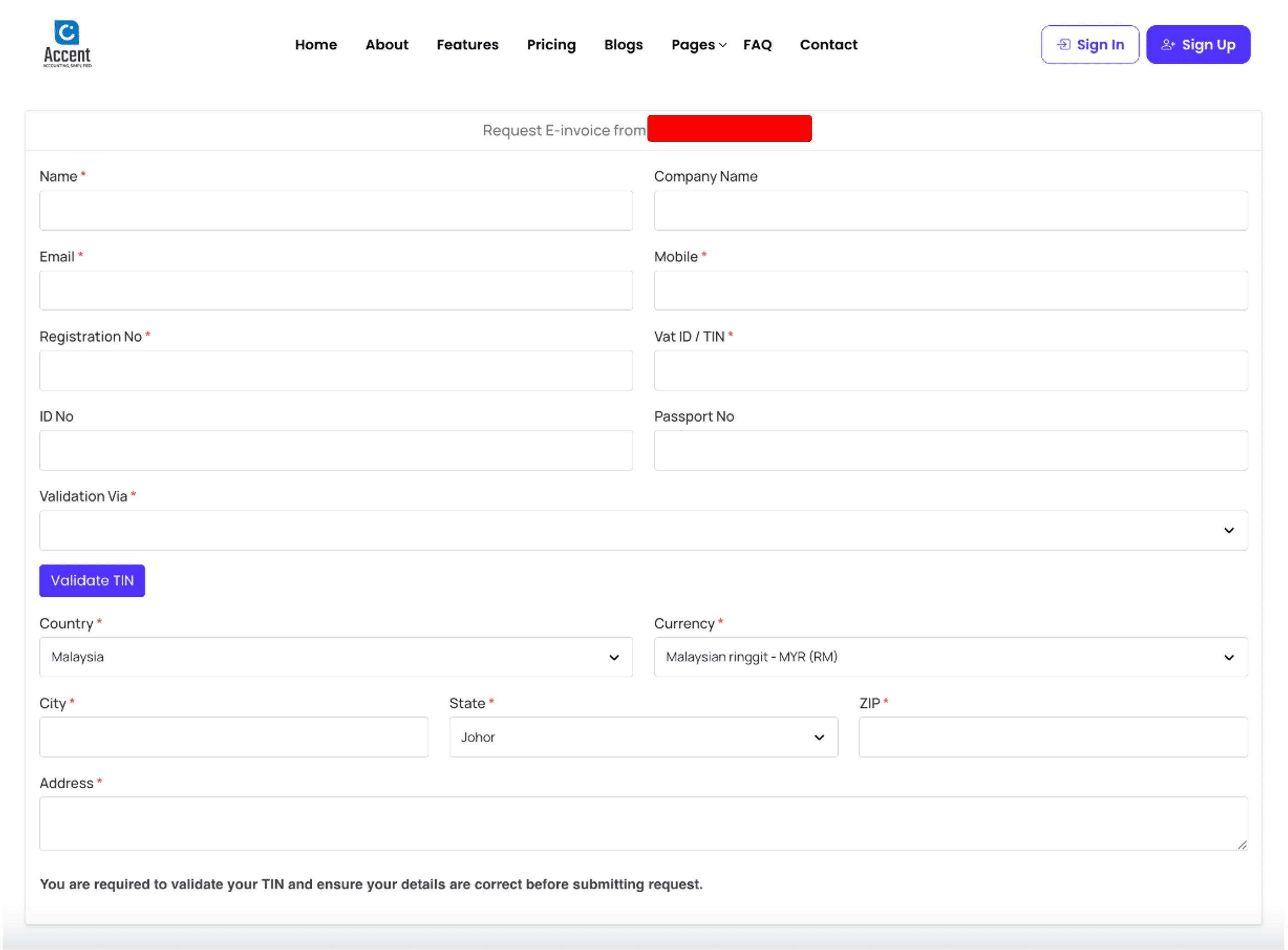 6. Customers must fill in the correct TIN number and also their details for validation, this is required by MyInvois Portal (LHDN server) to issue a valid E-invoice.