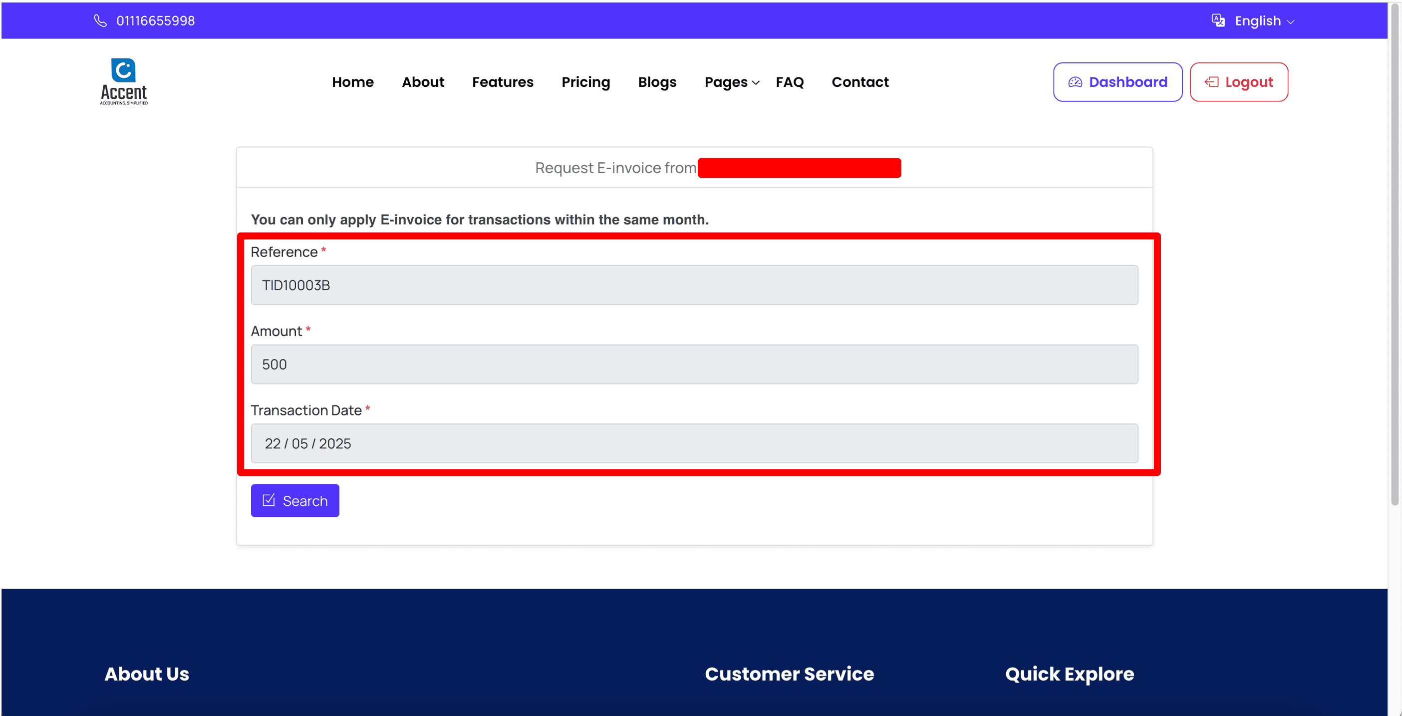 Your customer can directly click on the Search button to proceed to request E-invoice.