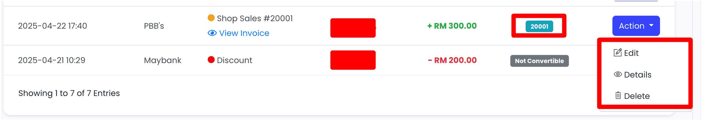 b. Find the specific transaction record that your customer requested, click on Action dropdown button.
