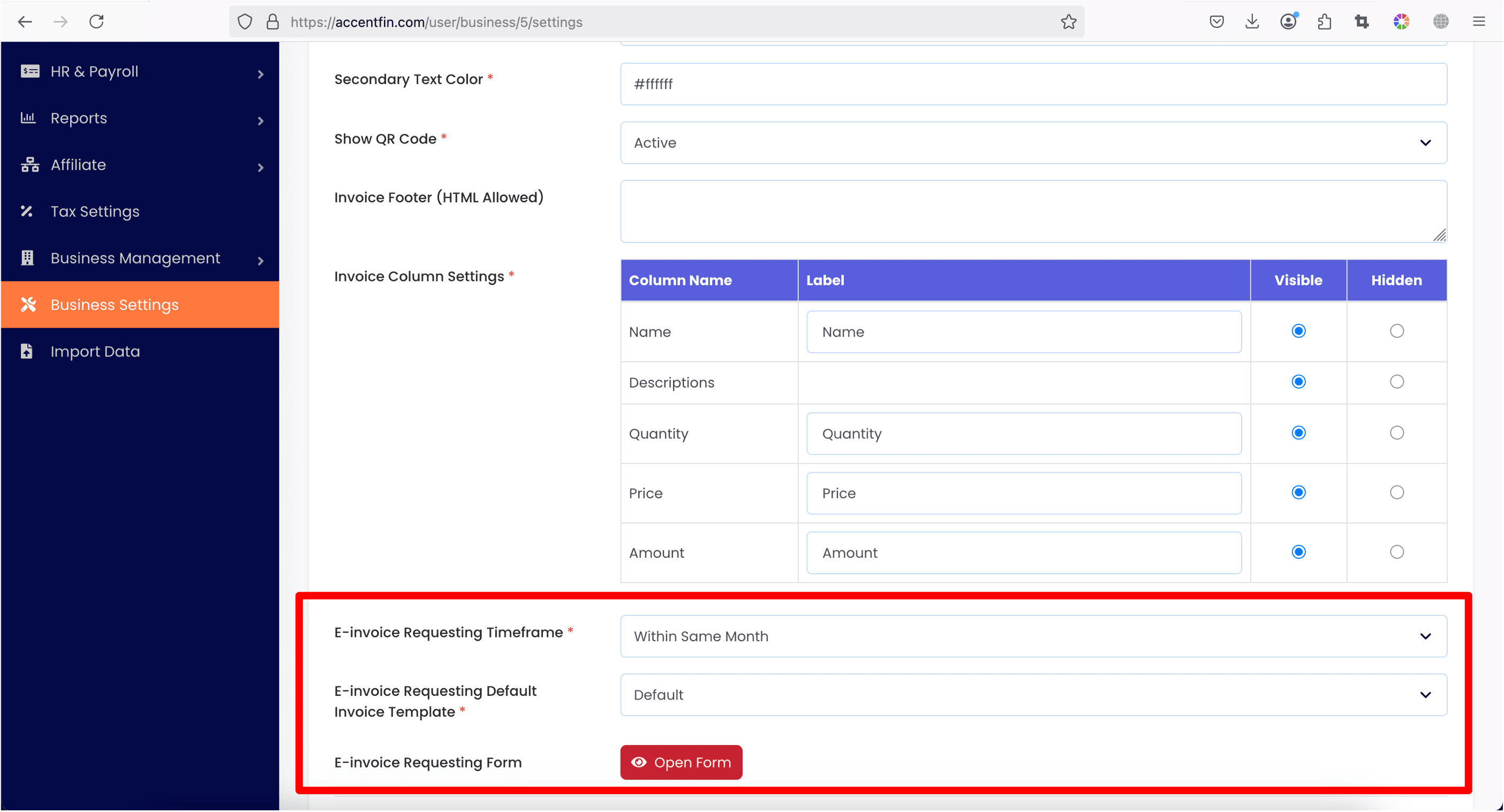 1. You may proceed to Business Settings located at the side menu. Then click on Invoice Settings located at the top bar. Scroll further down until you reach the settings for E-invoice Requesting Form.