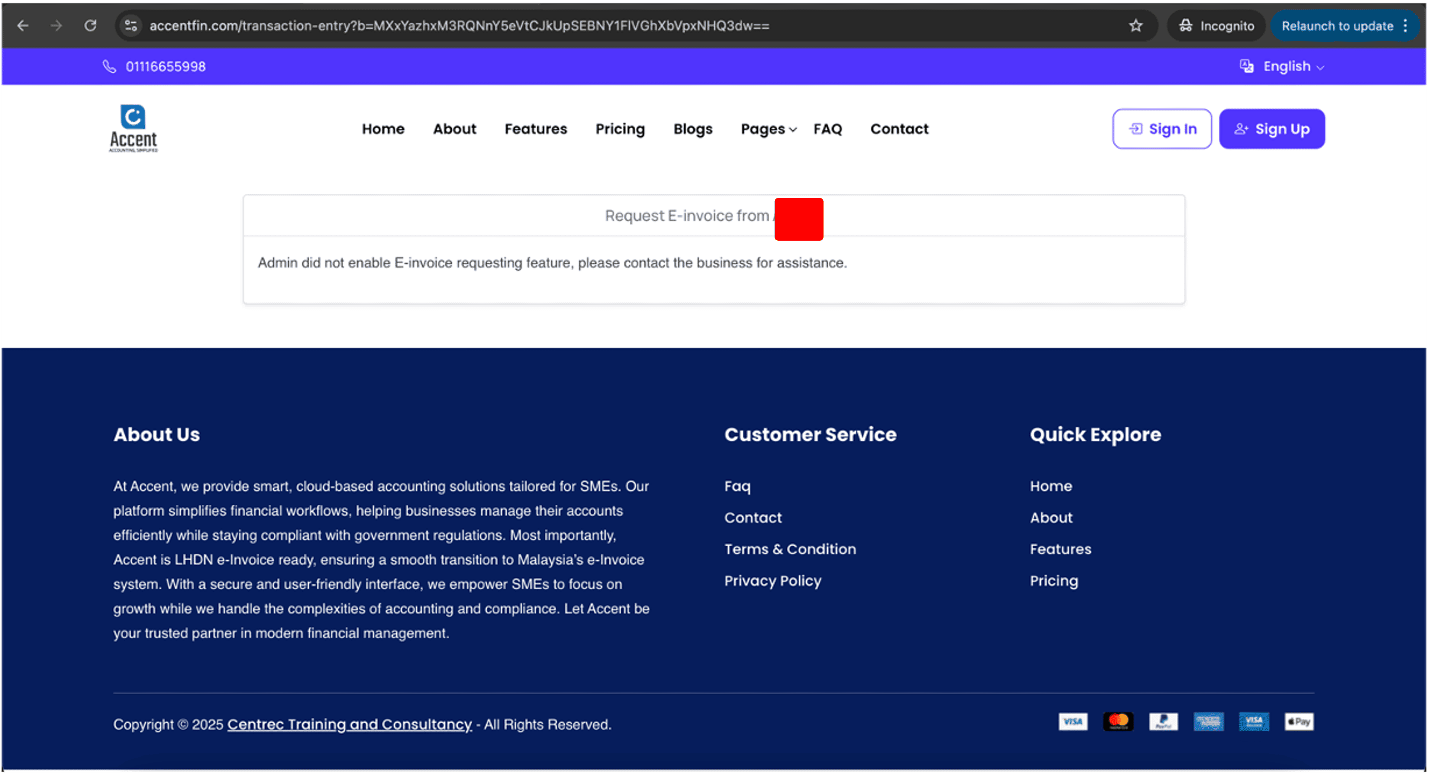 3. If you did not setup your Business Settings as mentioned on the above, your customers will not be able to request E-invoice from you (as shown in the screenshot below).