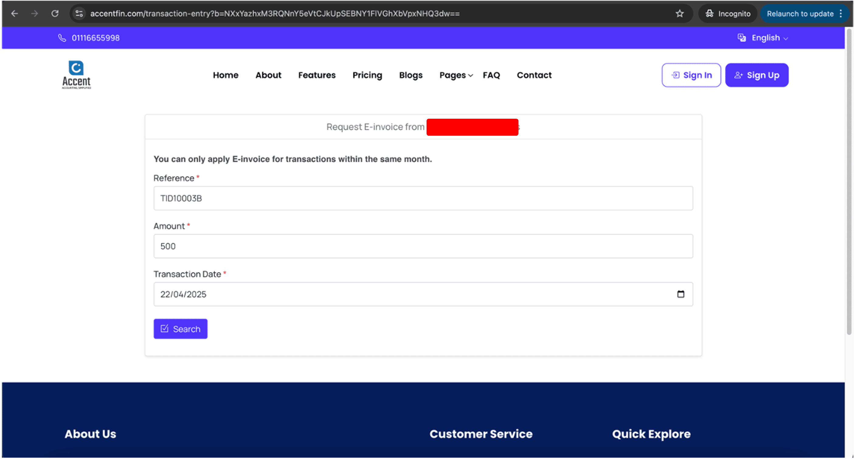 5. If a matching transaction is found, customers will be redirected to a form to fill in their details. These details are required by MyInvois Portal (LHDN server) to issue a valid E-invoice.