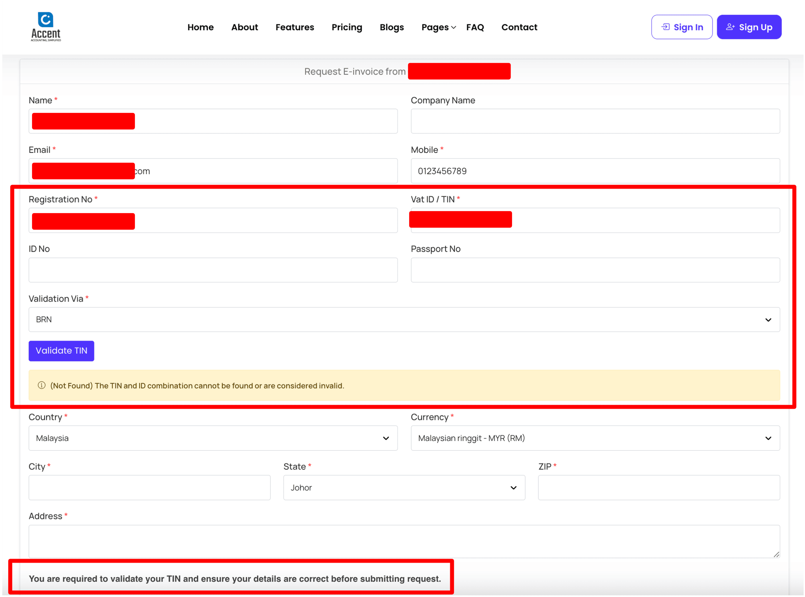 6. Customers must fill in the correct TIN number and also their details for validation, this is required by MyInvois Portal (LHDN server) to issue a valid E-invoice.