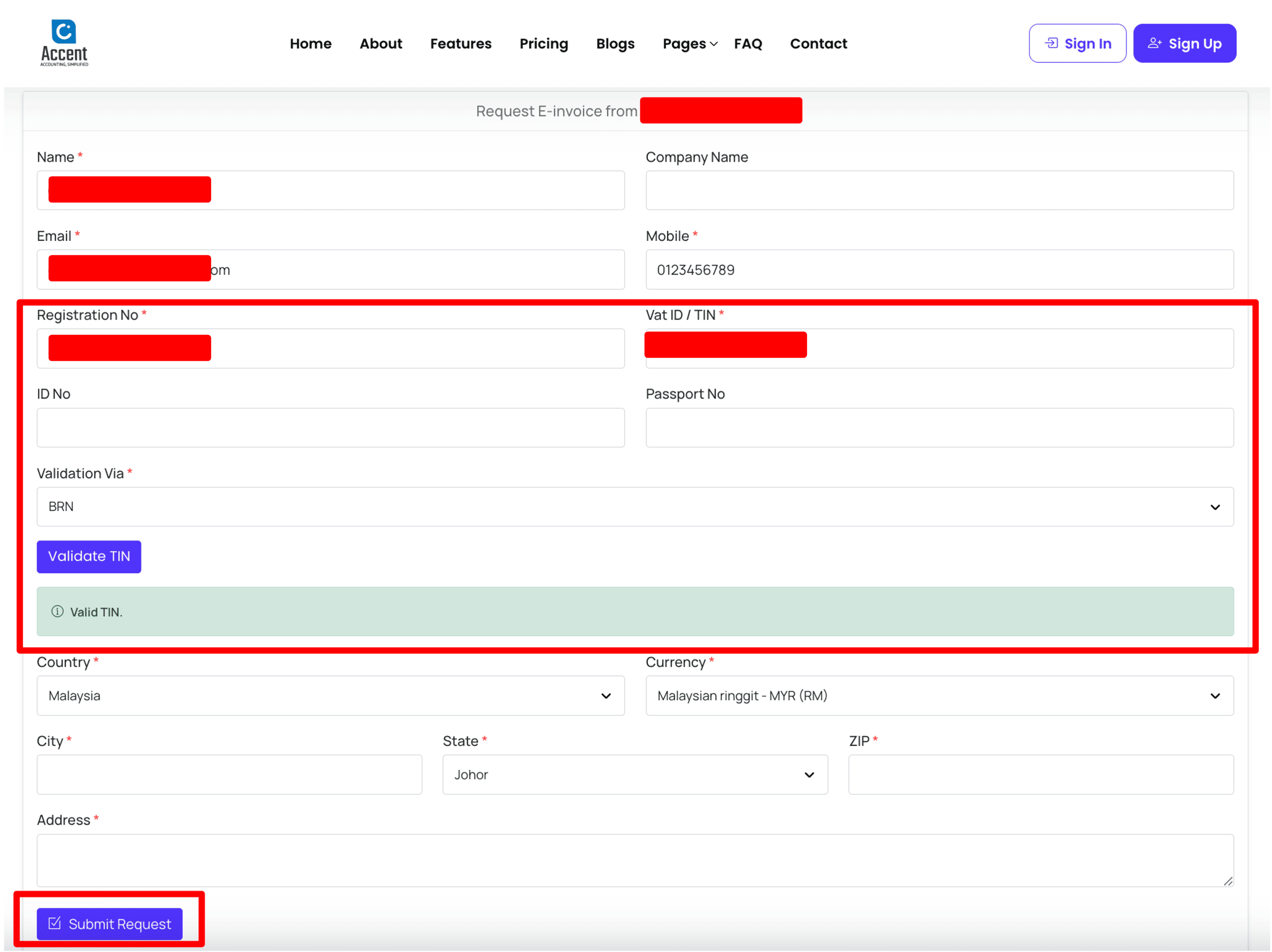 7. The following screenshot shows a successful validation results from MyInvois Portal (LHDN server). Once the TIN is validated successfully, customers can further fill in the remaining required fields and click on Submit Request.