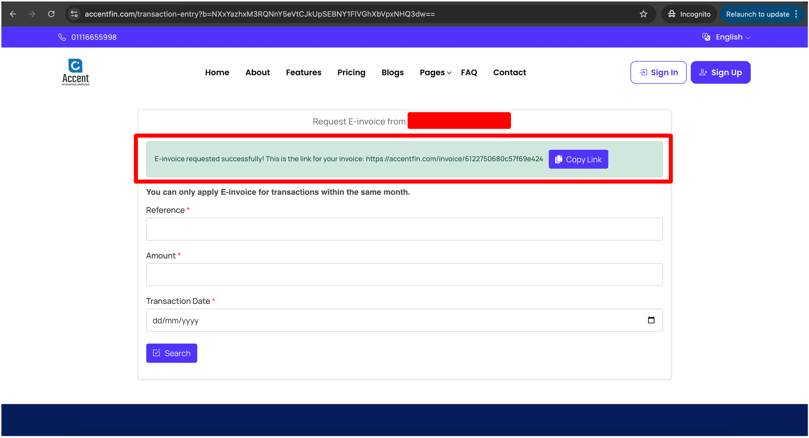 d. A popup model will appear on your screen with a link to the E-invoice Request Form of that specific transaction record you've selected. Click on Copy Link and send to your customer.